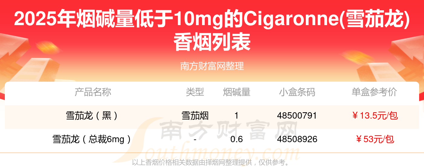 择烟网为大家盘点了烟碱量低于10mg的Cigaronne(雪茄龙)香烟,有雪茄龙(黑)、雪茄龙(总裁6mg)等,详细价格如下:
