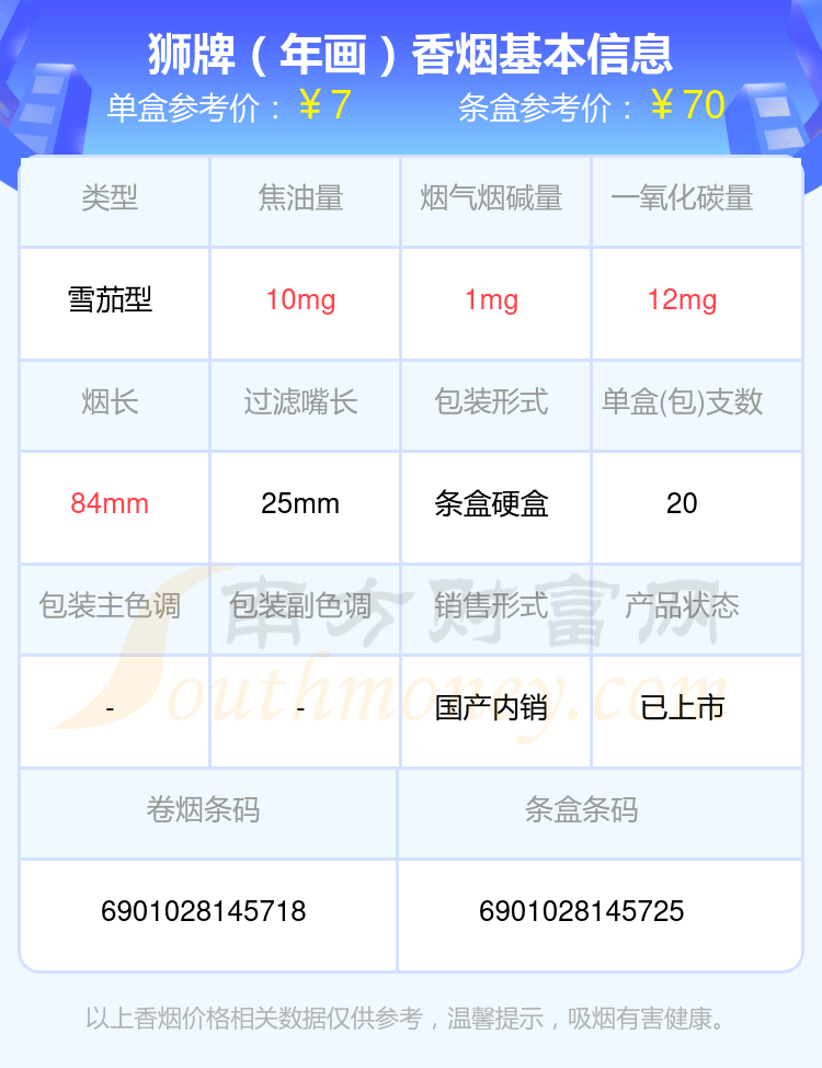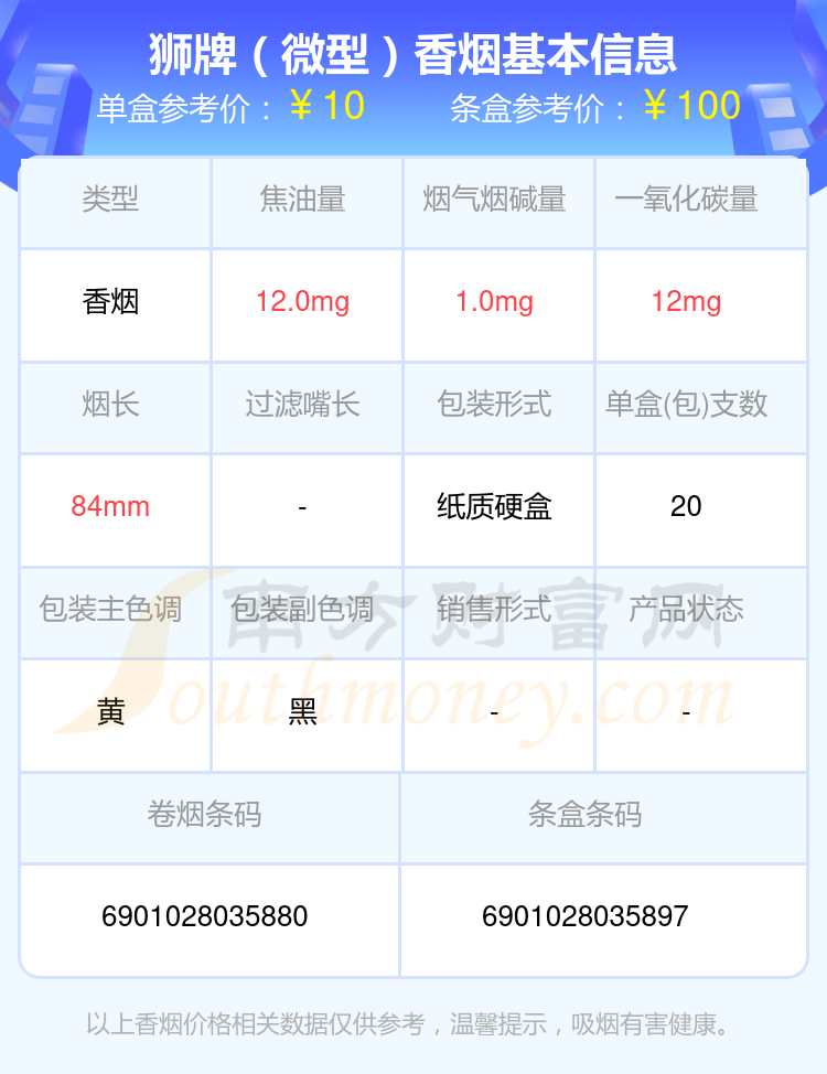 择烟网为大家盘点了狮牌香烟尼古丁1mg以下的,分别有狮牌(雄风)、狮牌(阆苑传奇)、狮牌(特香)、狮牌(微型)、狮牌(加勒比阳光)、狮牌(谜你3号)、狮牌(小号5支)、狮牌(10支完美时光)、狮牌(草莓)、狮牌(年画)等,具体价格如下: