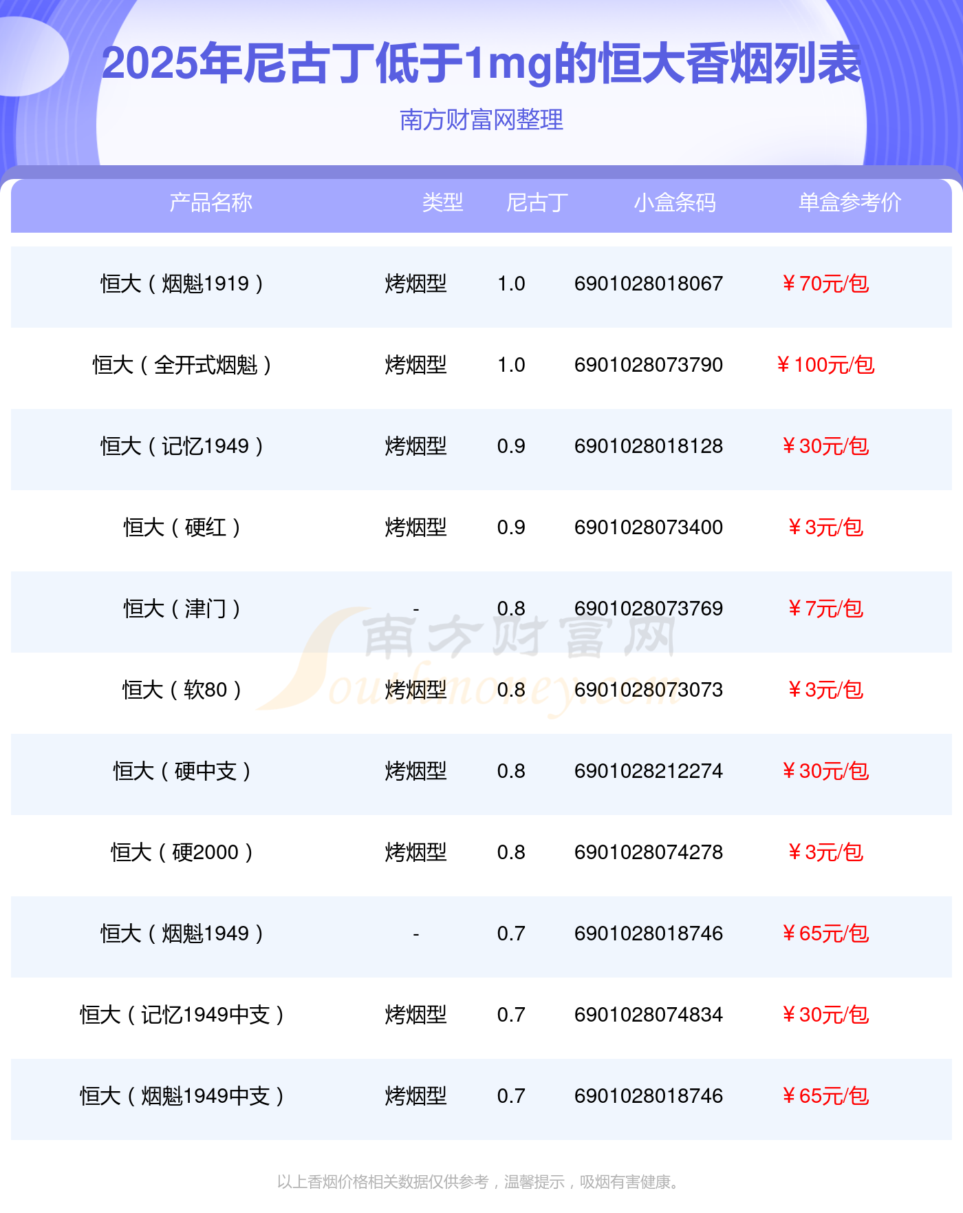 择烟网为大家盘点了尼古丁低于1mg的恒大香烟,有以下这些: