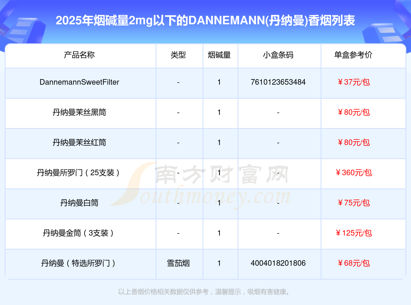 DANNEMANN(丹纳曼)香烟烟碱量2mg以下的烟有哪些?择烟网为大家整理提供,分别有:DannemannSweetFilter、丹纳曼茉丝黑筒、丹纳曼茉丝红筒、丹纳曼所罗门(25支装)、丹纳曼白筒、丹纳曼金筒(3支装)、丹纳曼(特选所罗门)等,具体价格如下:
