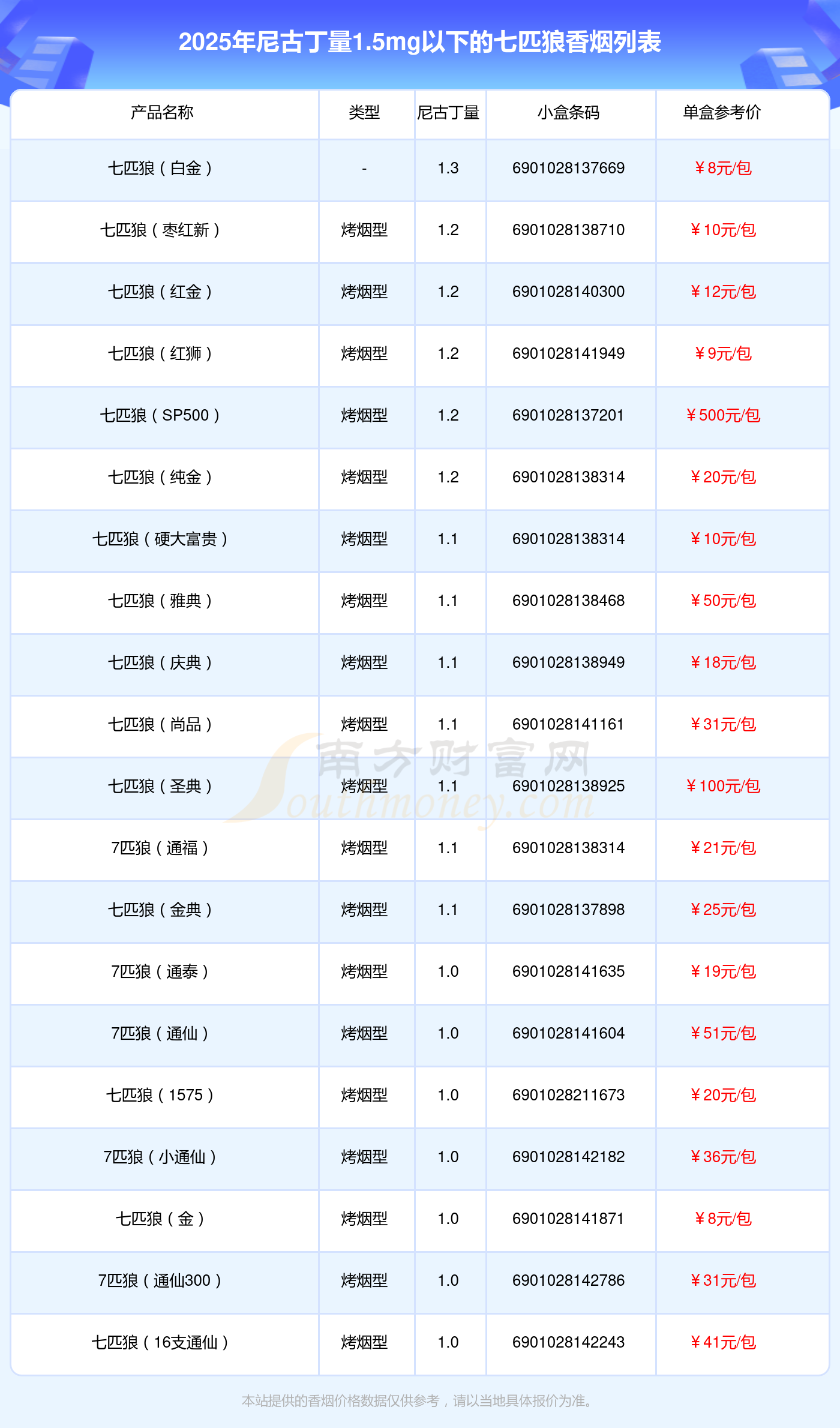 七匹狼(白金)参考价8元/包、七匹狼(枣红新)参考价10.0元/包、七匹狼(红金)参考价12.0元/包、七匹狼(红狮)参考价9.0元/包、七匹狼(SP500)参考价500.0元/包、七匹狼(纯金)参考价20.0元/包、七匹狼(硬大富贵)参考价10元/包、七匹狼(雅典)参考价50.0元/包、七匹狼(庆典)参考价18.0元/包、七匹狼(尚品)参考价31.0元/包等。