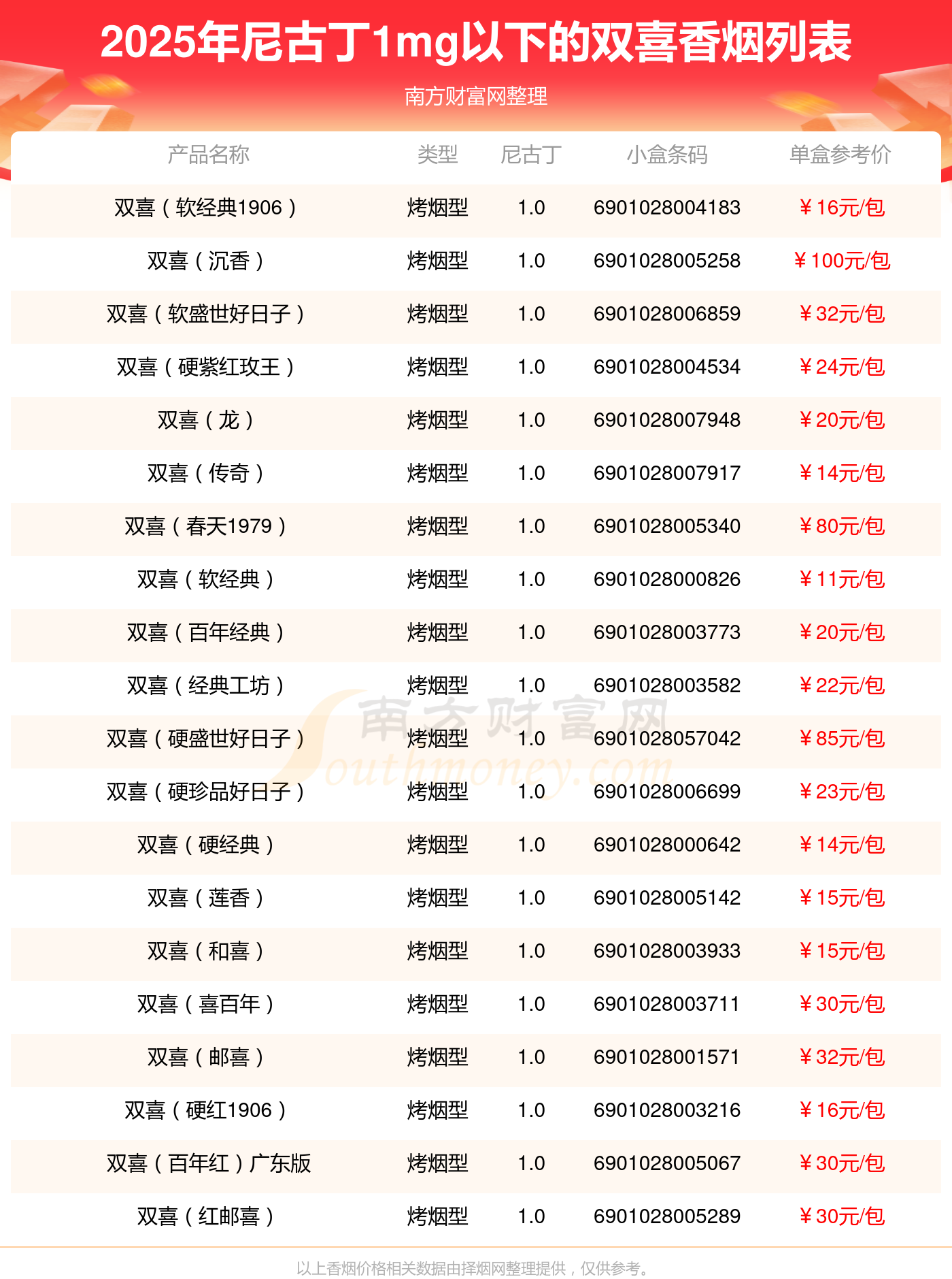 择烟网为大家盘点了尼古丁1mg以下的双喜香烟,分别有双喜(软经典1906)、双喜(沉香)、双喜(软盛世好日子)、双喜(硬紫红玫王)、双喜(龙)、双喜(传奇)、双喜(春天1979)、双喜(软经典)、双喜(百年经典)、双喜(经典工坊)等,具体价格如下: