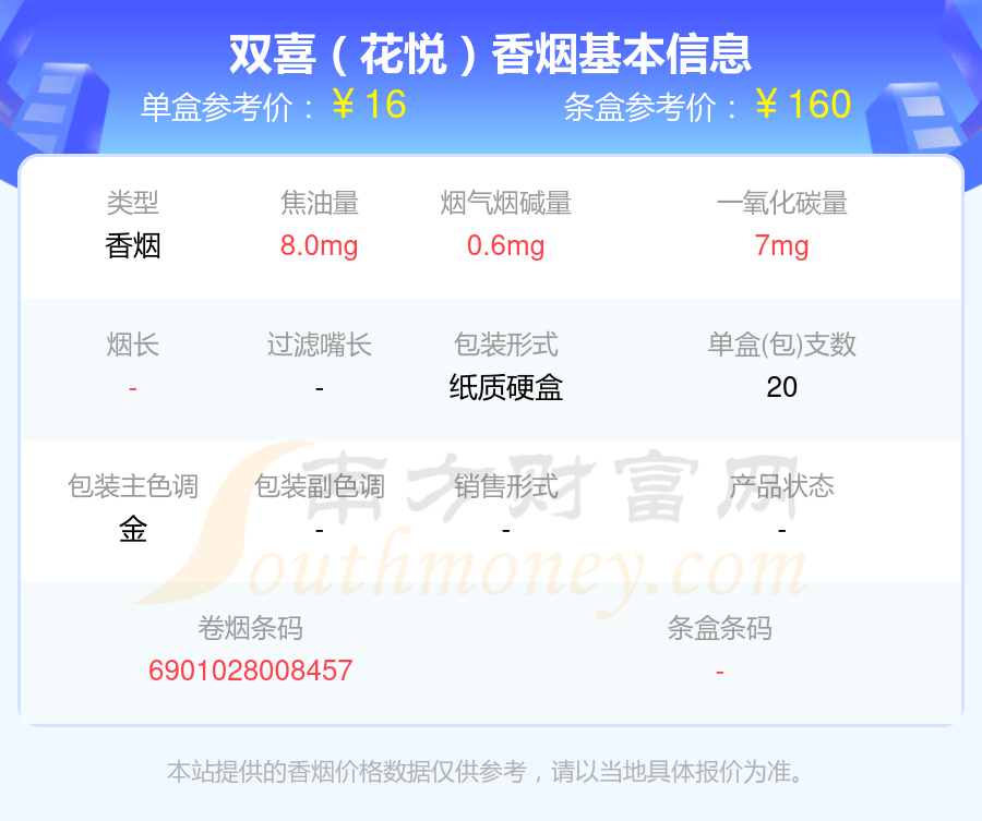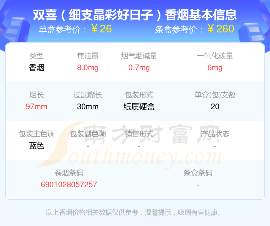 焦油量8mg以下的双喜香烟有哪些?择烟网为大家整理盘点,分别有:双喜(细支晶彩好日子)、双喜(花悦)旧版、双喜(花悦)、双喜(硬祥云好日子)、双喜(硬蓝红玫王)、双喜(红玫王软蓝)、双喜(传奇)老版、双喜(春天细支)、双喜(硬红逸品)、双喜(软金1906)等,具体价格如下: