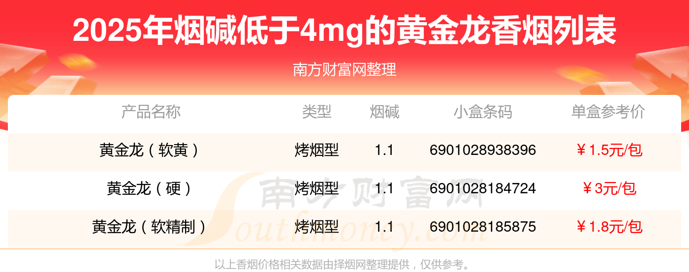 烟碱低于4mg的黄金龙香烟有哪些?择烟网为大家整理盘点,分别有:黄金龙(软黄)、黄金龙(硬)、黄金龙(软精制)等,具体价格如下:
