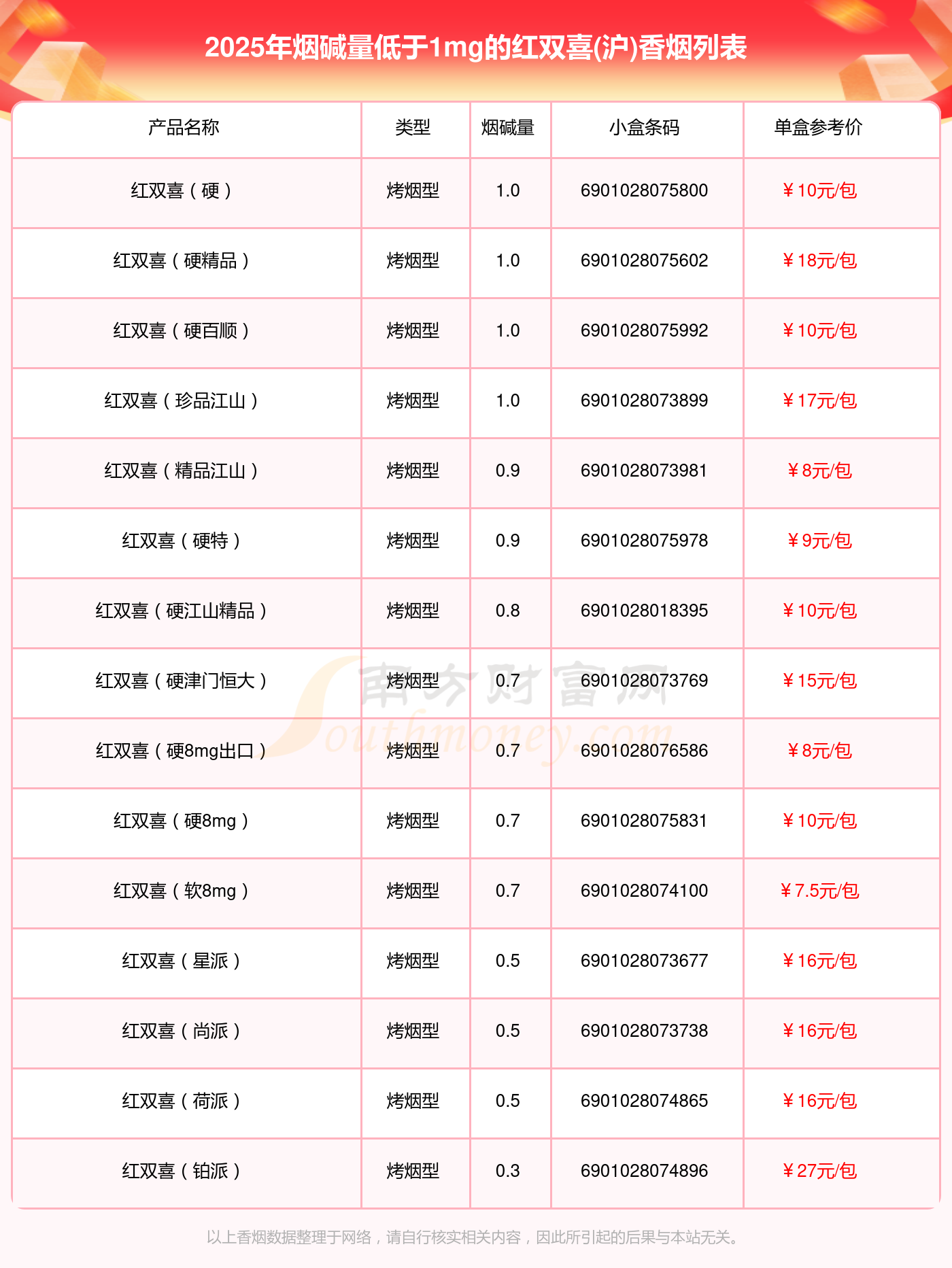 择烟网为大家盘点了红双喜(沪)香烟烟碱量低于1mg的,分别有红双喜(硬)、红双喜(硬精品)、红双喜(硬百顺)、红双喜(珍品江山)、红双喜(精品江山)、红双喜(硬特)、红双喜(硬江山精品)、红双喜(硬津门恒大)、红双喜(硬8mg出口)、红双喜(硬8mg)等,详细价格如下: