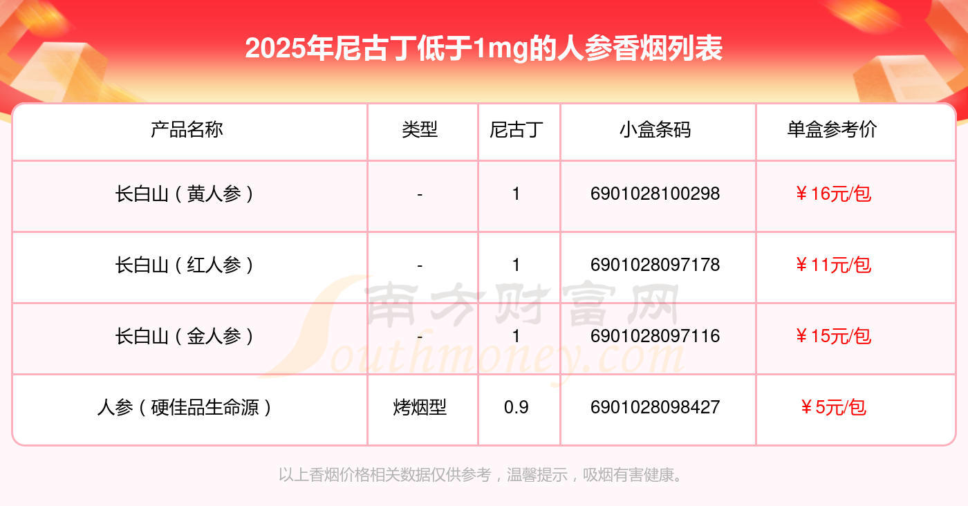 人参香烟尼古丁低于1mg的烟有长白山(黄人参)、长白山(红人参)、长白山(金人参)、人参(硬佳品生命源)等,具体价格如下: