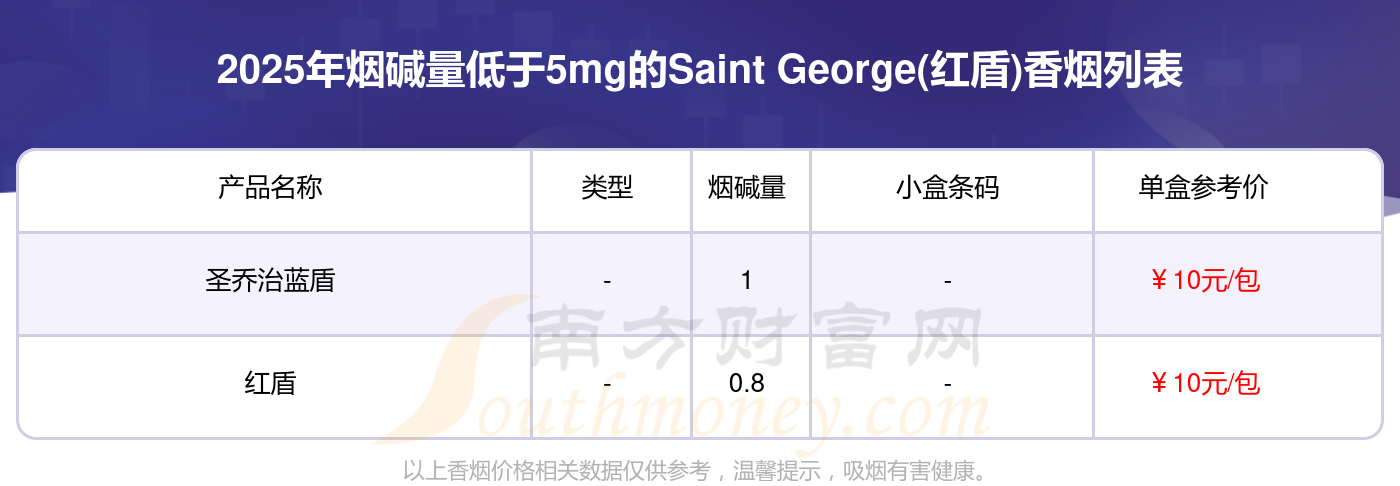 2025年烟碱量低于5mg的Saint George(红盾)香烟查询一览