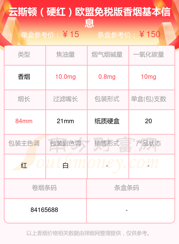 云斯顿(经典澳门版)参考价15.5元/包、云斯顿(硬红)欧盟免税版参考价15.0元/包、云斯顿(硬蓝)南非版参考价18.0元/包、云斯顿(硬蓝)欧盟免税版参考价15.0元/包、云斯顿(蓝俄罗斯版)参考价38.0元/包、云斯顿(铁盒)俄罗斯版参考价11.0元/包等。