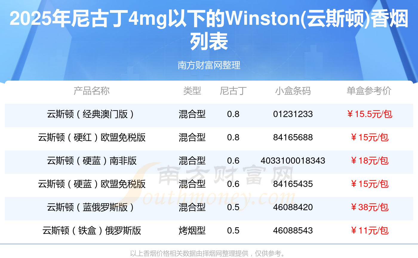 尼古丁4mg以下的Winston(云斯顿)香烟有哪些?择烟网为大家整理盘点,有云斯顿(经典澳门版)、云斯顿(硬红)欧盟免税版、云斯顿(硬蓝)南非版、云斯顿(硬蓝)欧盟免税版、云斯顿(蓝俄罗斯版)、云斯顿(铁盒)俄罗斯版等,详细价格如下: