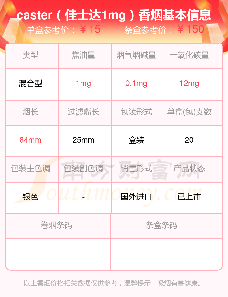 CASTER(佳士达)香烟焦油量5mg以下的烟有佳士达(红中免)、佳士达(硬红)、佳士达(红)、佳士达(黄)、caster(佳士达1mg)等,详细价格如下: