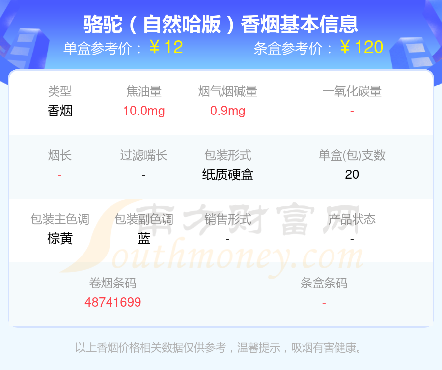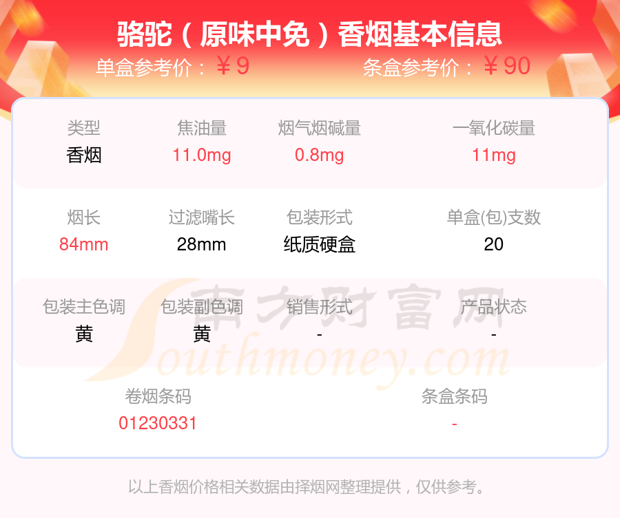 择烟网为大家盘点了CAMEL(骆驼)香烟尼古丁10mg以下的,分别有骆驼(自然哈版)、骆驼(原味中免)、骆驼(硬黄)吉尔吉斯斯坦含税版、骆驼(硬黄)塔吉克斯坦含税版、骆驼(卡斯特)免税版、骆驼(八角硬黄)中烟专卖版、骆驼(烟草版)、骆驼(硬)新版、骆驼(原味新版)、骆驼(黑)等,具体价格如下: