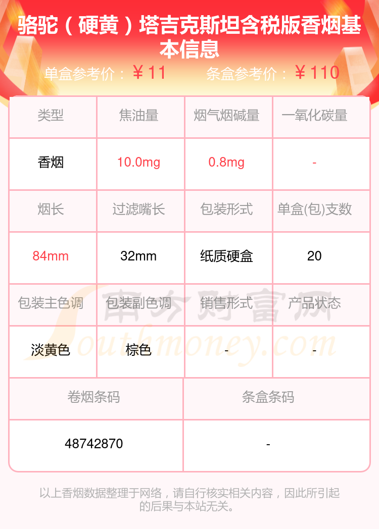4、骆驼(硬黄)塔吉克斯坦含税版