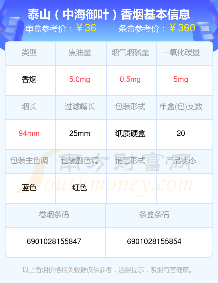 泰山香烟尼古丁量低于0.5mg的烟分别有泰山(乐章)参考价26.0元/包、泰山(中海御叶)参考价36.0元/包等。