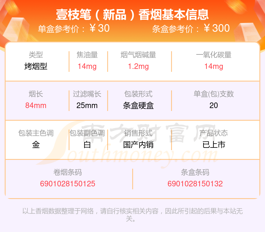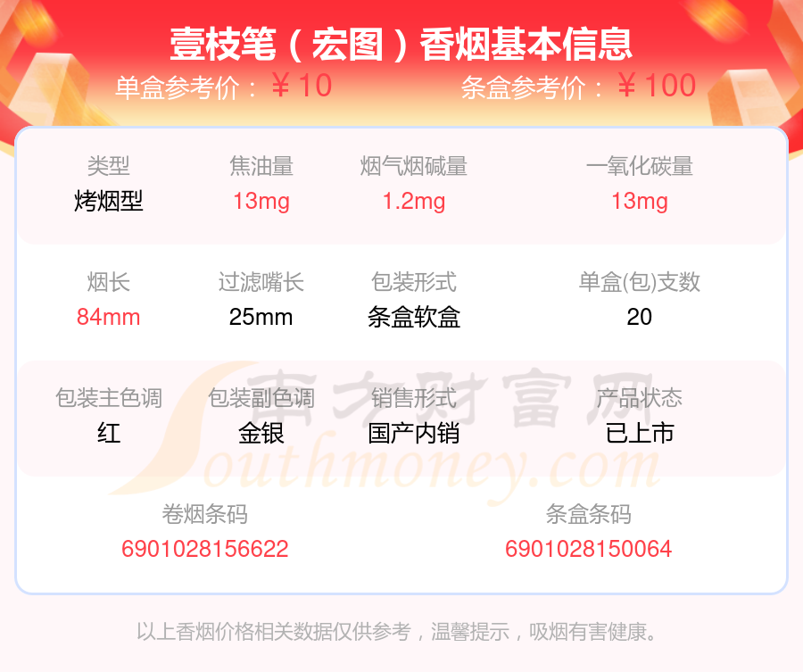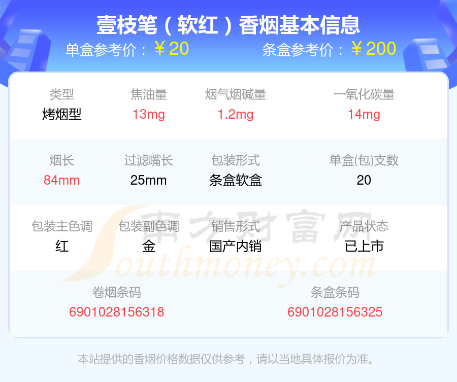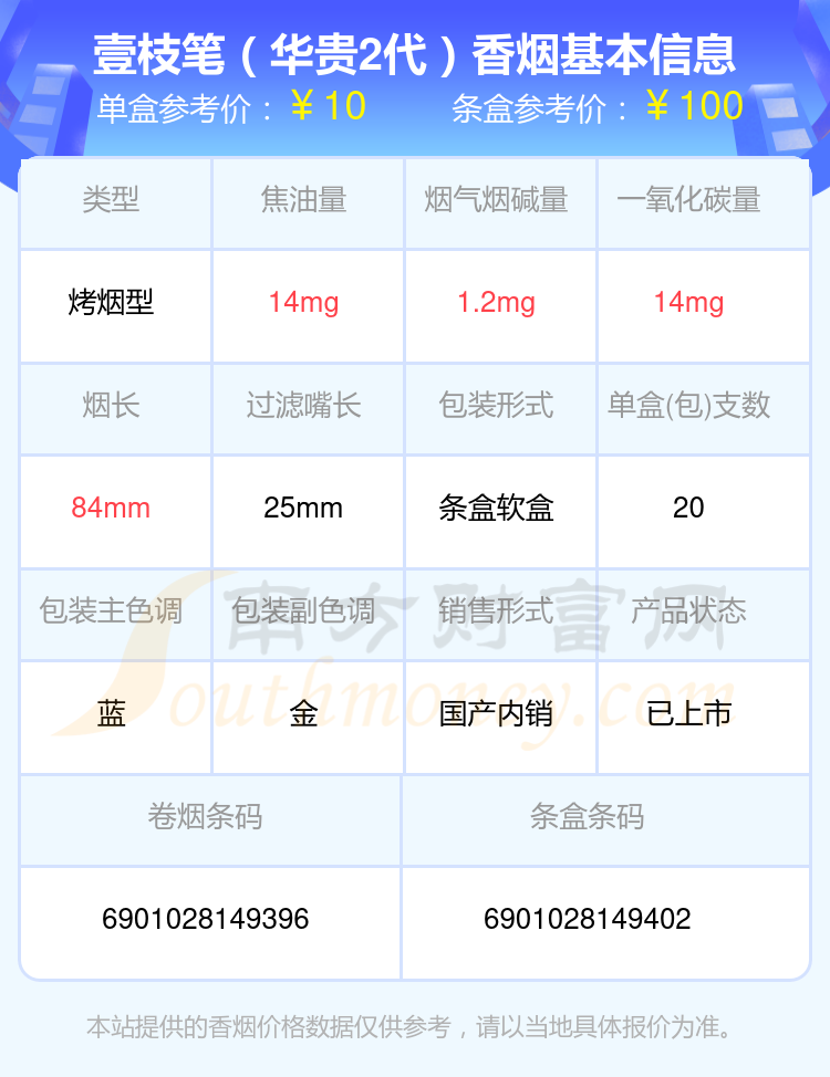壹枝笔(新品)参考价30元/包、壹枝笔(新贵)参考价8元/包、壹枝笔(华贵2代)参考价10元/包、壹枝笔(珍贵)参考价50元/包、壹枝笔(宏图)参考价10元/包、壹枝笔(华贵)参考价10元/包、壹枝笔(软红)参考价20元/包等。