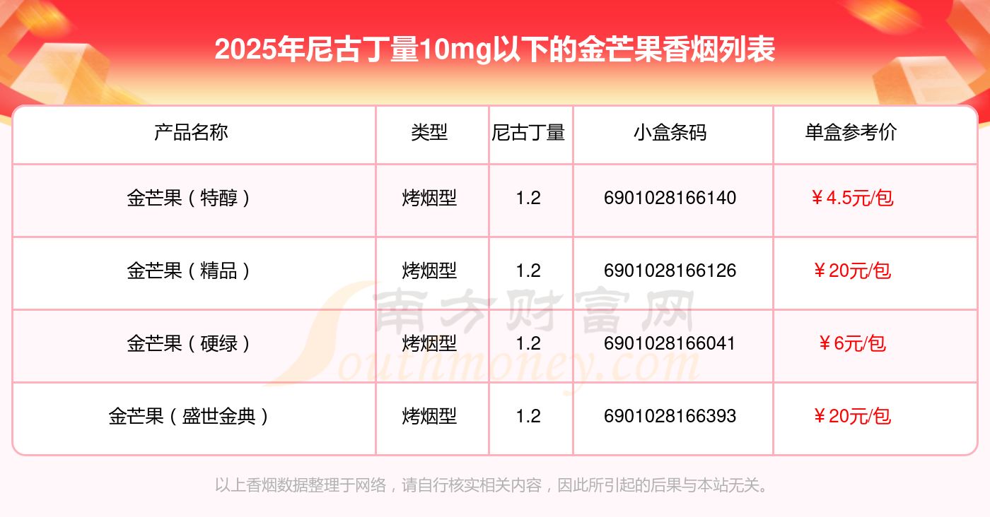 择烟网为大家盘点了金芒果香烟尼古丁量10mg以下的,分别有金芒果(特醇)、金芒果(精品)、金芒果(硬绿)、金芒果(盛世金典)等,具体价格如下: