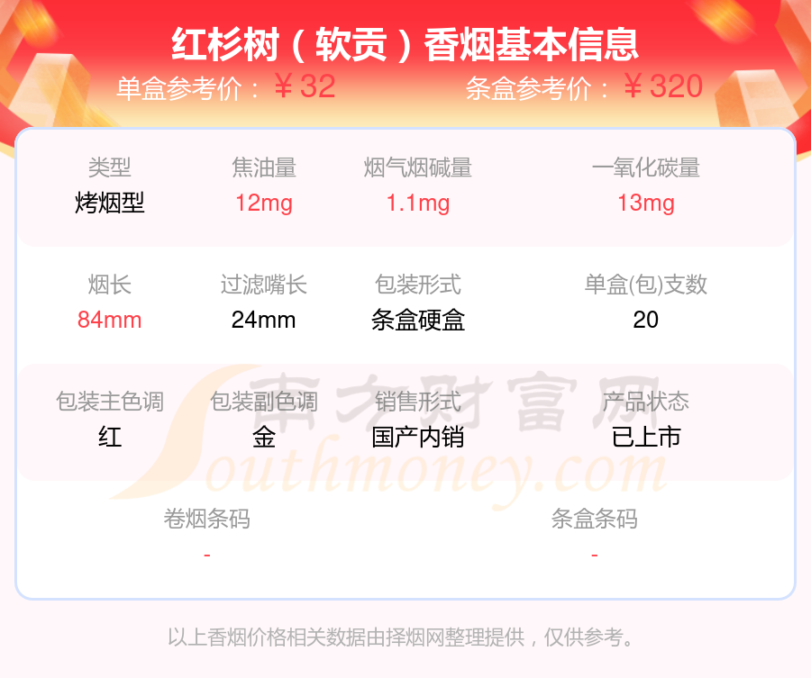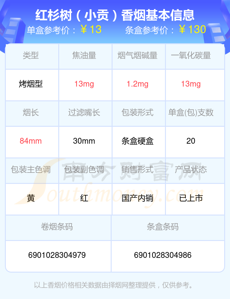 红杉树(五星)参考价15.0元/包、红杉树(软五星)参考价20.0元/包、红杉树(大贡)参考价26.0元/包、红杉树(精品)参考价7.0元/包、红杉树(小贡)参考价13元/包、红杉树(软五星C)参考价22元/包、红杉树(软贡)参考价32元/包、红杉树(大贡C)参考价18元/包、南京(硬林.红杉树)参考价13元/包、红杉树(新醇)参考价6元/包等。