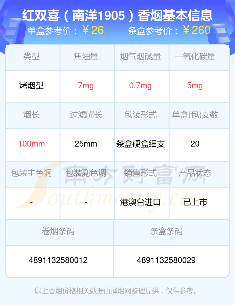择烟网为大家盘点了红双喜香烟烟碱量低于4mg的,分别有红双喜(南洋经典)、红双喜(大喜)、红双喜(龙凤紫)、红双喜(经典1905中支)、红双喜(花开富贵)、红双喜(爱国)、红双喜(经典1905)、红双喜(南洋1905)等,详细价格如下: