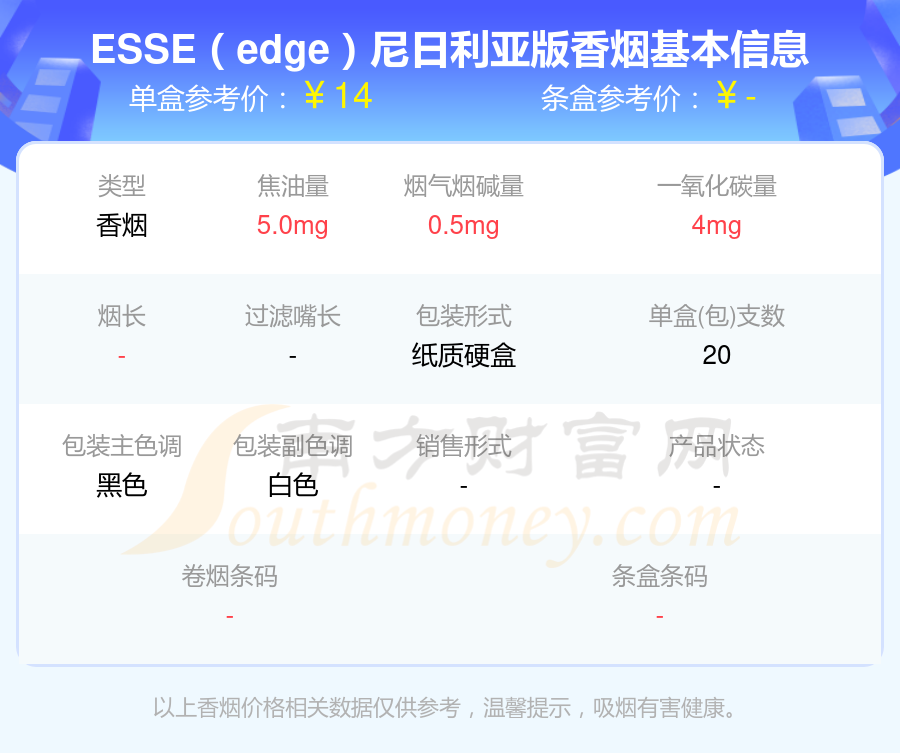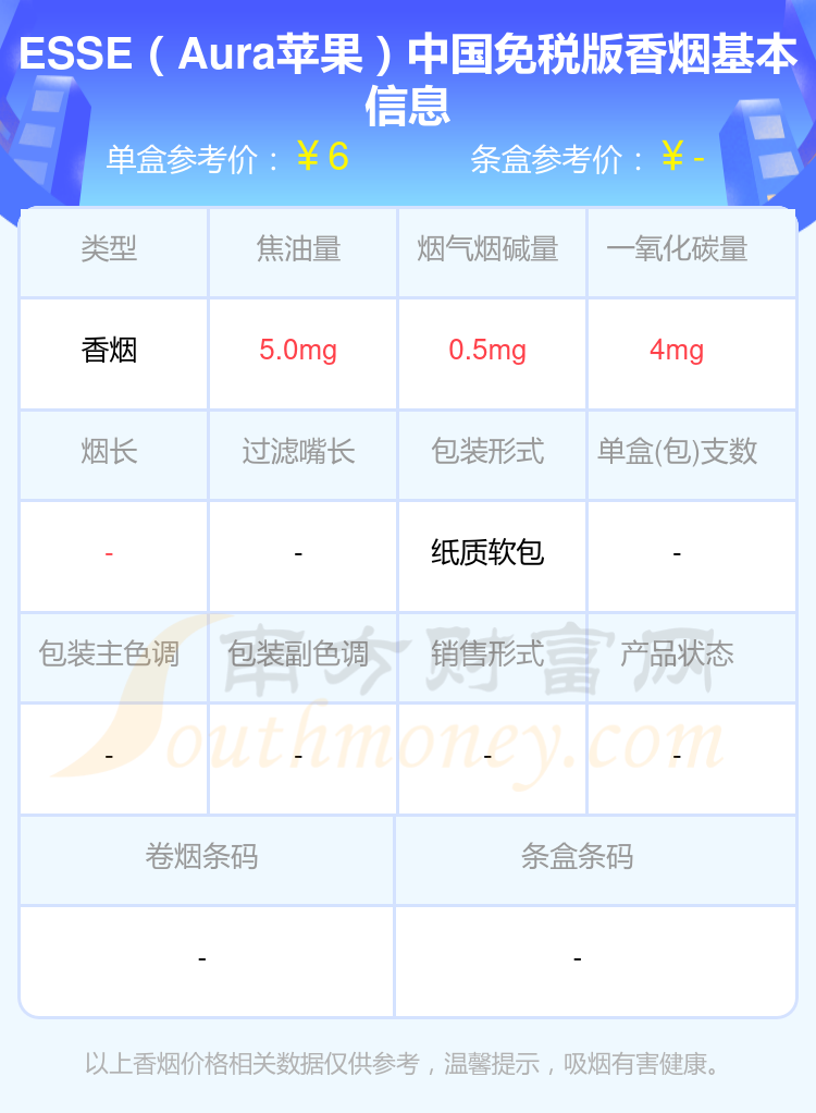 ESSE(爱喜)香烟烟碱量1mg以下的烟有ESSE(经典)6mg、爱喜(经典)、ESSE(Aura苹果)中国免税版、爱喜(蓝)、ESSE(edge)尼日利亚版、ESSE(薄荷)5mg、爱喜(薄荷)、爱喜(蓝特醇免税韩版)、爱喜(银松)、爱喜(幻变)旧版等,详细价格如下: