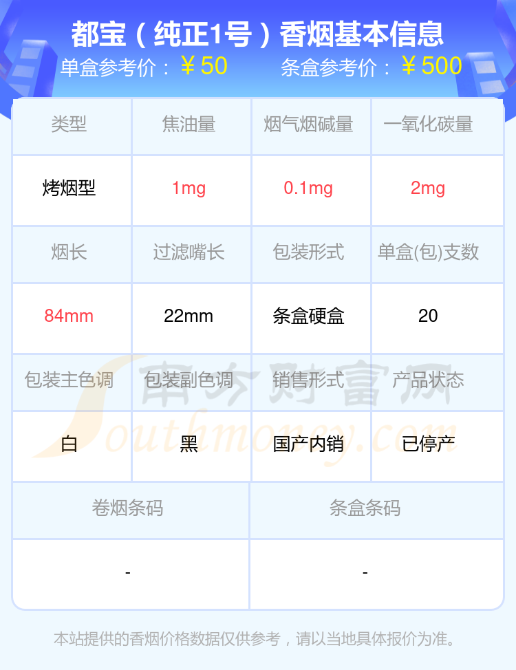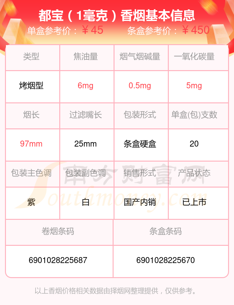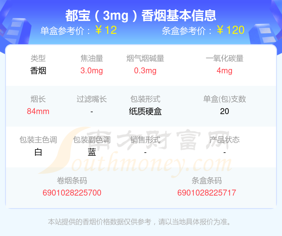都宝香烟烟碱量低于0.5mg的烟有都宝(蓝莓细支)、都宝(1毫克)、都宝(3mg)、都宝(纯正1号)等,详细价格如下: