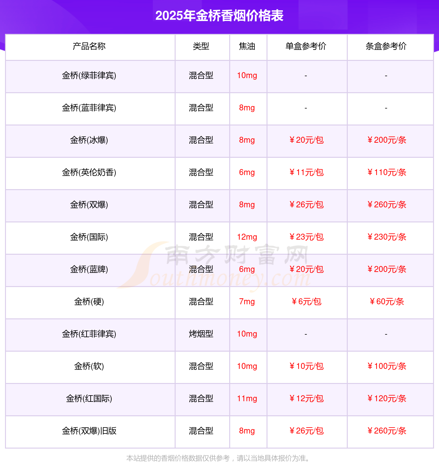 金桥(双爆)参考价26.0元/包、金桥(双爆)旧版参考价26.0元/包、金桥(国际)参考价23.0元/包、金桥(冰爆)参考价20.0元/包、金桥(蓝牌)参考价20.0元/包、金桥(红国际)参考价12.0元/包、金桥(英伦奶香)参考价11.0元/包。