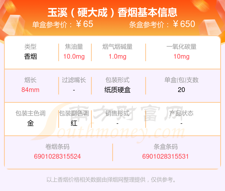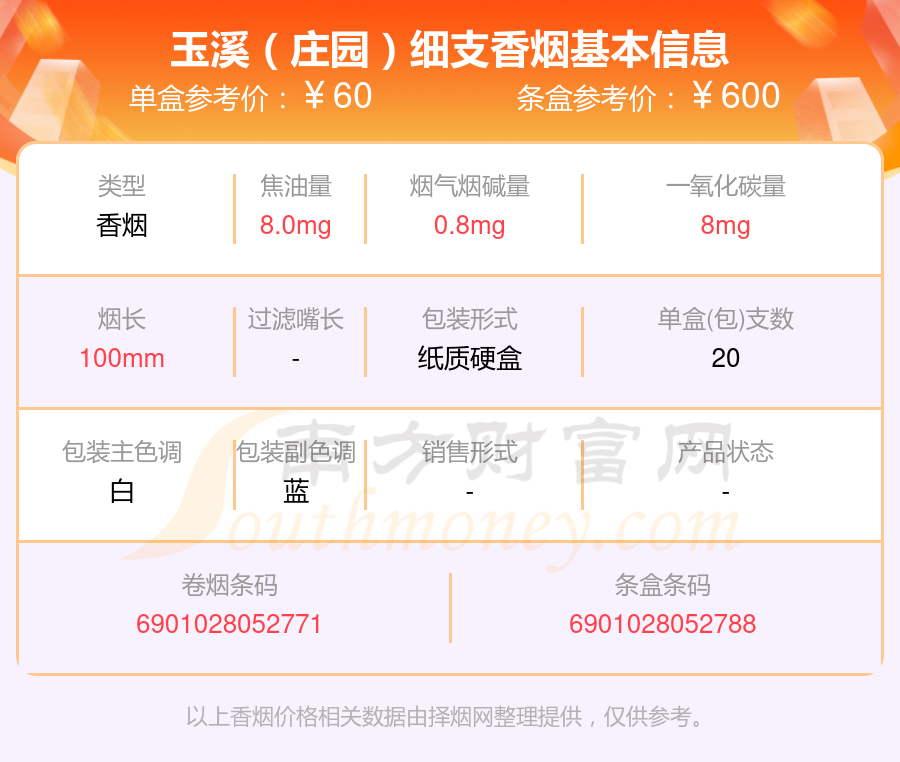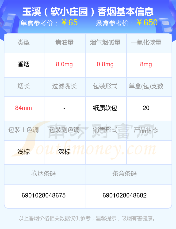 玉溪香烟六十元到七十元的烟分别有玉溪(软小庄园)参考价65.0元/包、玉溪(硬大成)参考价65.0元/包、玉溪(庄园)细支参考价60.0元/包、玉溪(100细支钓鱼台)参考价60元/包等。