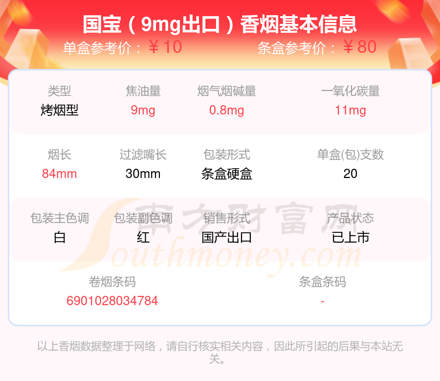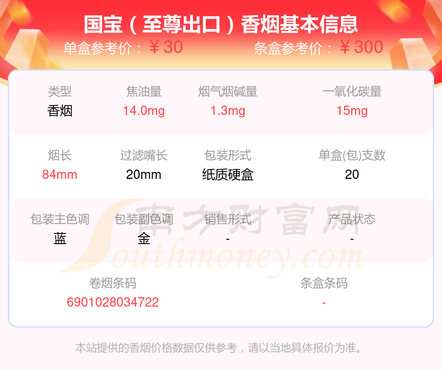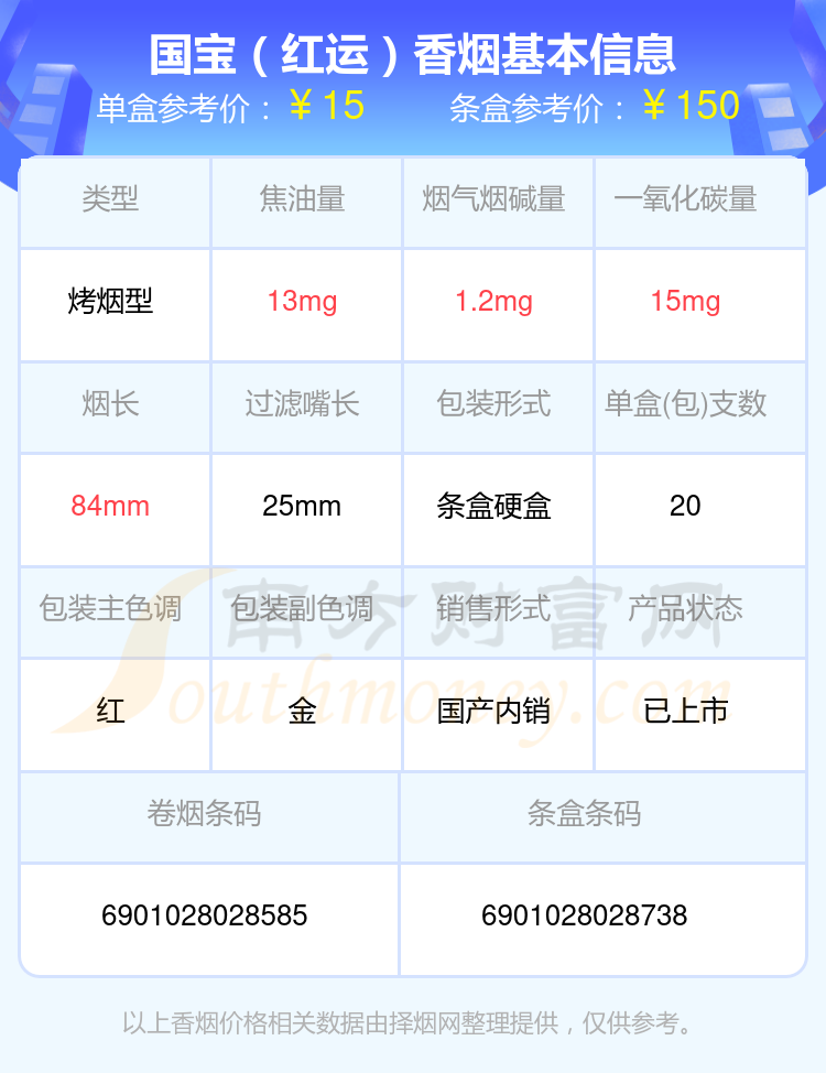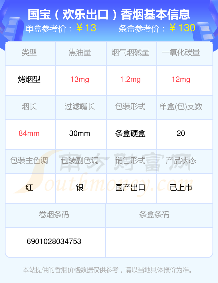 择烟网为大家盘点了国宝香烟十元至五十元左右的,分别有国宝(至尊出口)、国宝(硬至尊)、国宝(红运)、国宝(欢乐出口)、国宝(9mg出口)等,具体价格如下: