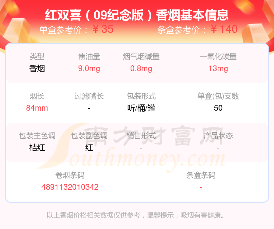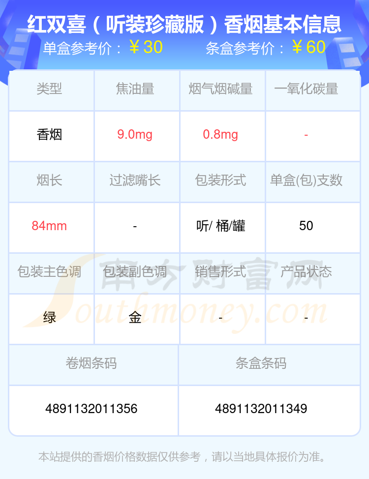 30元~40元的红双喜(港)香烟有哪些?择烟网为大家整理盘点,有红双喜(听装珍藏版·浅绿)、红双喜(09纪念版)、红双喜(听装珍藏版)等,详细价格如下: