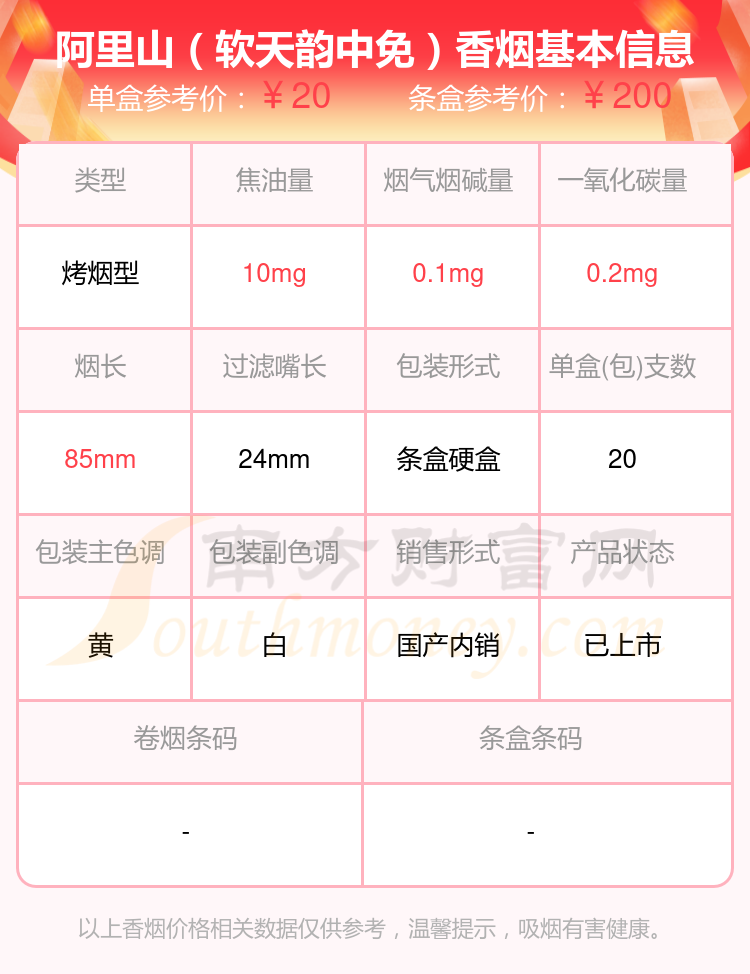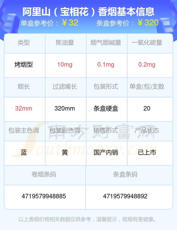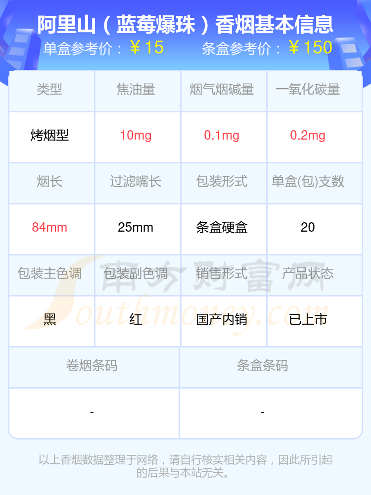 择烟网为大家盘点了烟碱量0.3mg以下的阿里山香烟,有阿里山(宝相花)、阿里山(蓝莓爆珠)、阿里山(软天韵中免)等,详细价格如下: