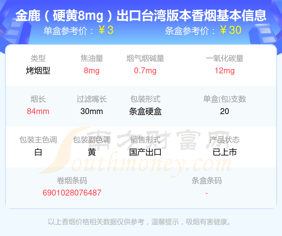 金鹿(硬黄8mg)出口台湾版本香烟价格2025_一包多少钱?