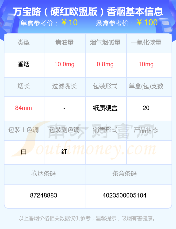 万宝路(硬红欧盟版)香烟网友评分:口味7.8分,外观7.2分,性价比7.4分,综合得分7.5分。