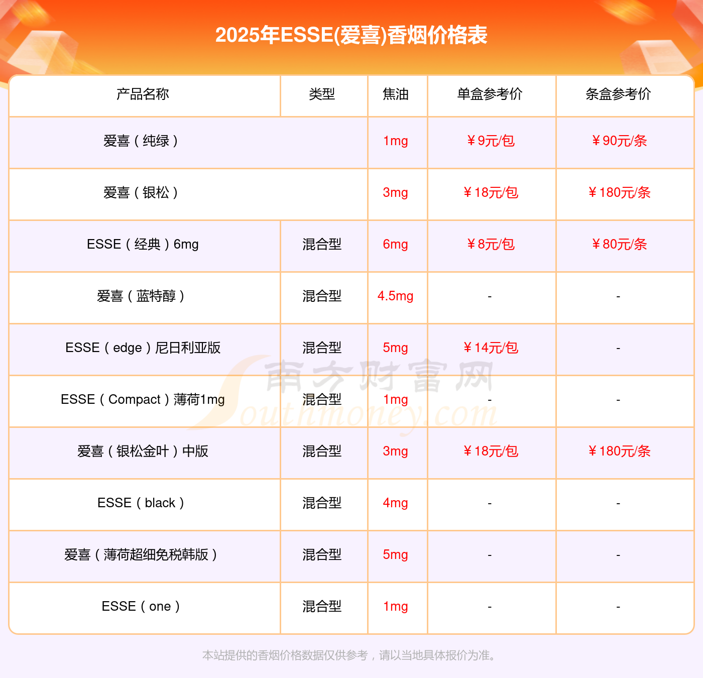 ESSE爱喜是韩国烟草公司旗下的品牌之一,目前中国大陆市场主要规格有ESSE薄荷(绿爱喜)、ESSE经典(红爱喜)、Esse特醇(蓝爱喜)、Esse银松(黑爱喜)等,是低刺激柔和的香烟。
