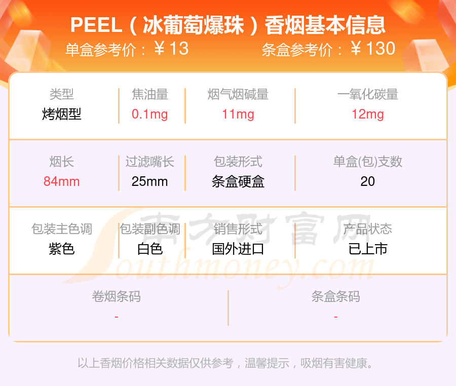 择烟网为大家盘点了PEEL百乐香烟焦油量8mg以下的,分别有百乐(葡萄日免版)、PEEL(冰葡萄爆珠)等,详细价格如下: