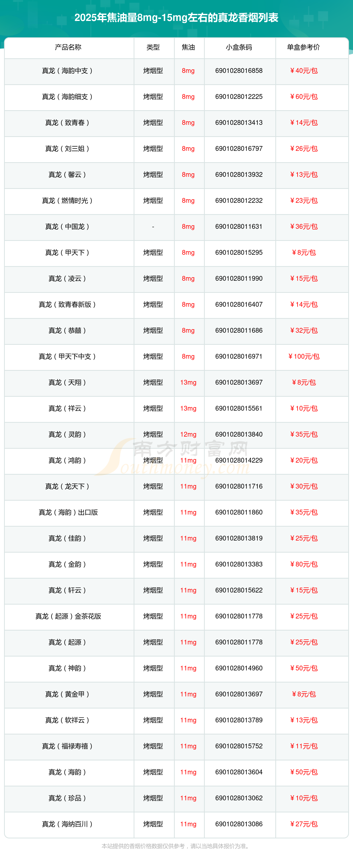 择烟网为大家盘点了真龙香烟焦油量8mg-15mg左右的烟,有以下这些: