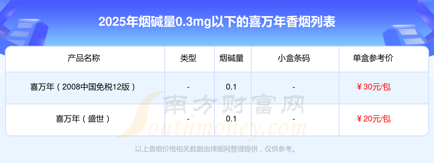 烟碱量0.3mg以下的喜万年香烟有哪些?择烟网为大家整理盘点,有喜万年(2008中国免税12版)、喜万年(盛世)等,详细价格如下: