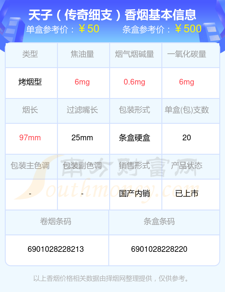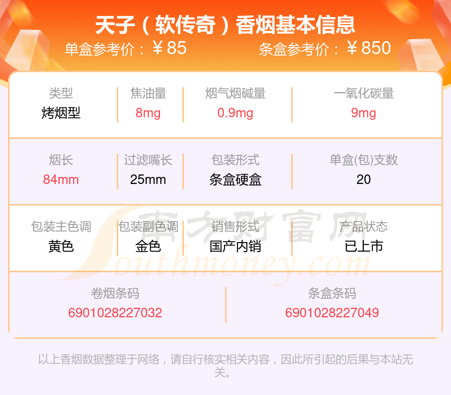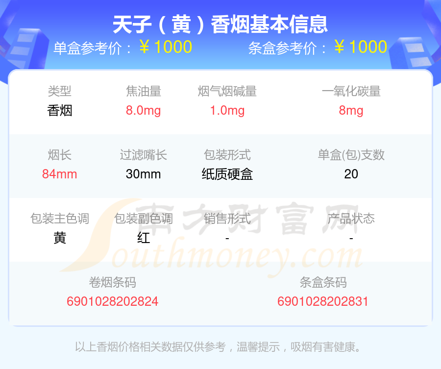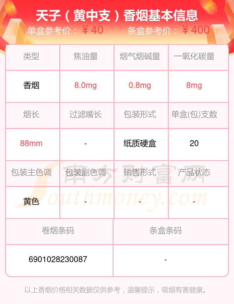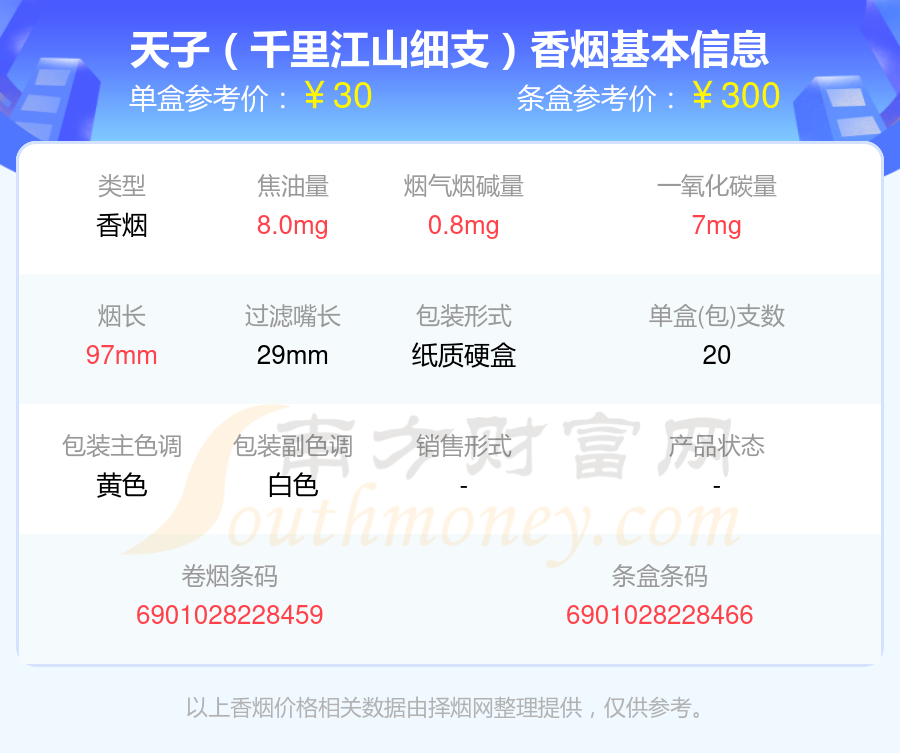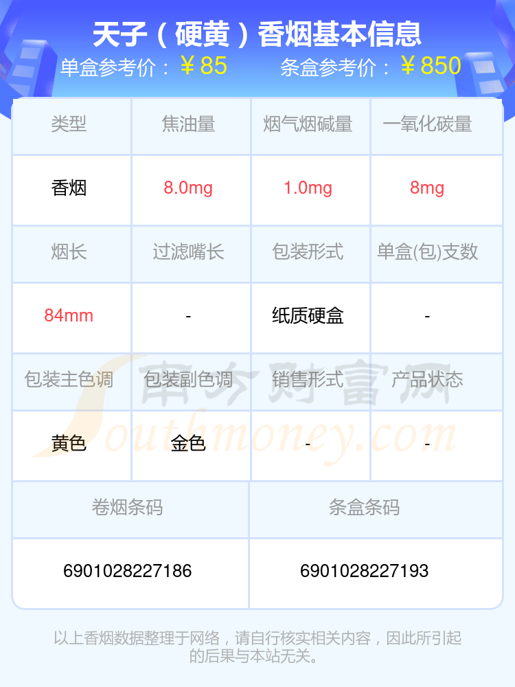 天子(黄中支)参考价40.0元/包、天子(千里江山细支)参考价30.0元/包、天子(黄 宽版)参考价99.0元/包、天子(硬黄)参考价85.0元/包、天子(黄)参考价1000.0元/包、天子(C位)参考价20元/包、天子(软传奇)参考价85元/包、天子(金如意细支)参考价30元/包、天子(细支传奇)参考价50.0元/包、天子(传奇细支)参考价50元/包等。