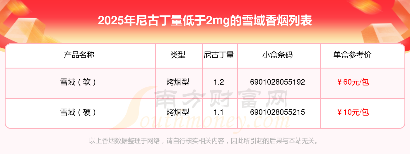 择烟网为大家盘点了雪域香烟尼古丁量低于2mg的,分别有雪域(软)、雪域(硬)等,具体价格如下: