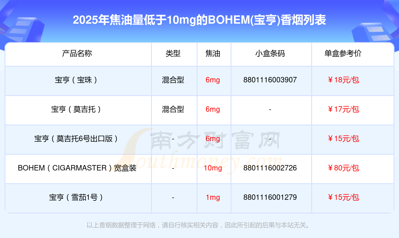 焦油量低于10mg的BOHEM(宝亨)香烟有哪些?择烟网为大家整理盘点,分别有:宝亨(宝珠)、宝亨(莫吉托)、宝亨(莫吉托6号出口版)、BOHEM(CIGARMASTER)宽盒装、宝亨(雪茄1号)等,具体价格如下: