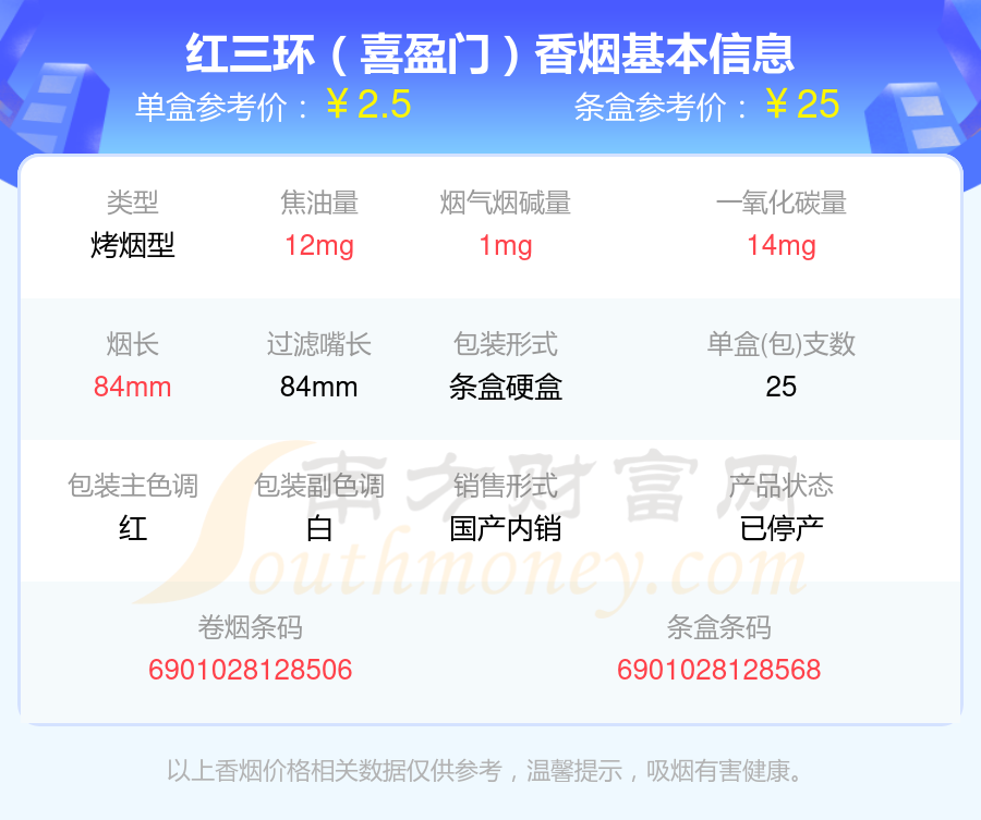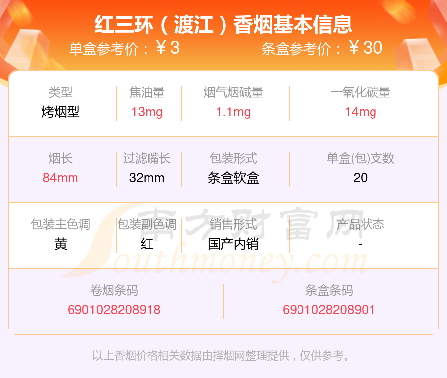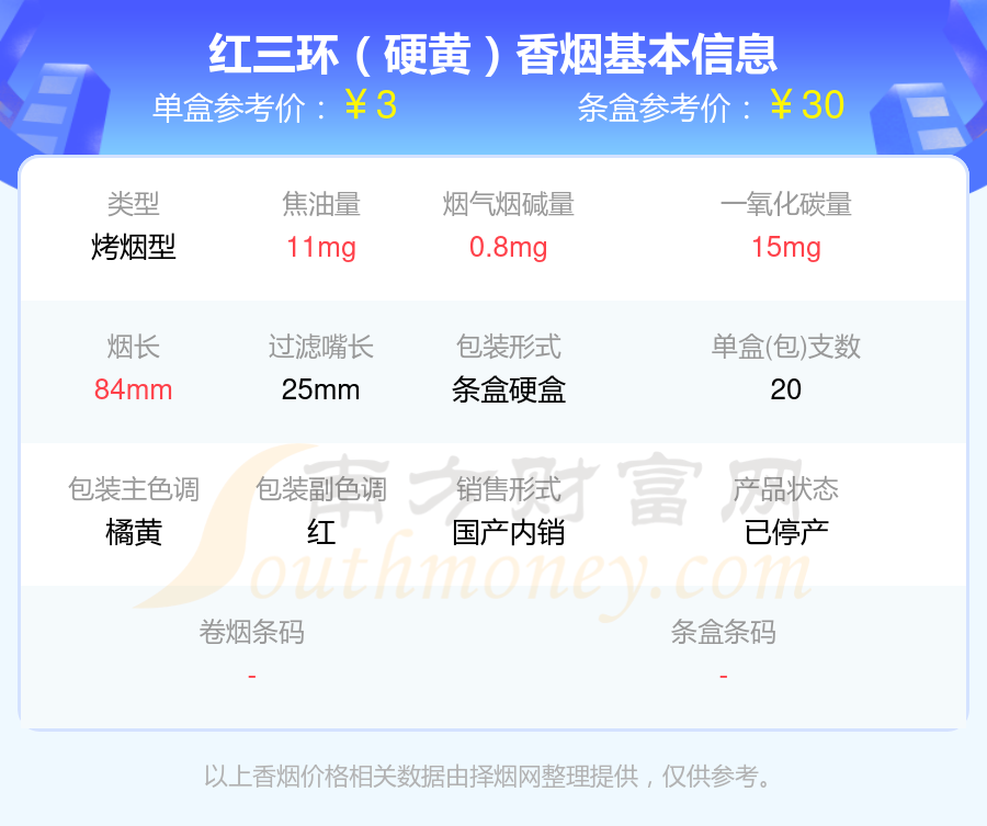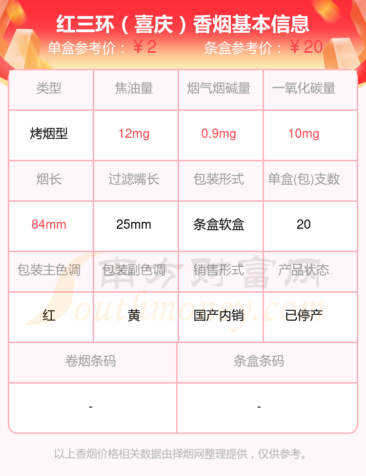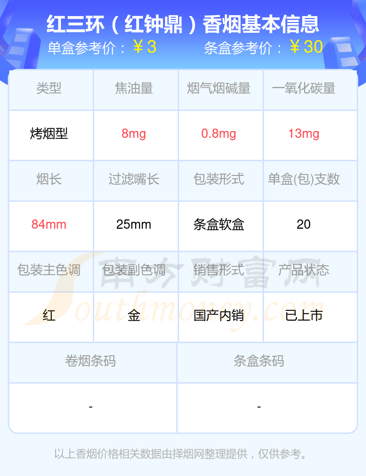 红三环香烟烟碱2mg以下的烟有红三环(8+12)、红三环(五福盈门)、红三环(红)、红三环(幸福篇)、红三环(渡江)、红三环(喜盈门)、红三环(喜庆)、红三环(软黄)、红三环(红钟鼎)、红三环(硬黄)等,具体价格如下: