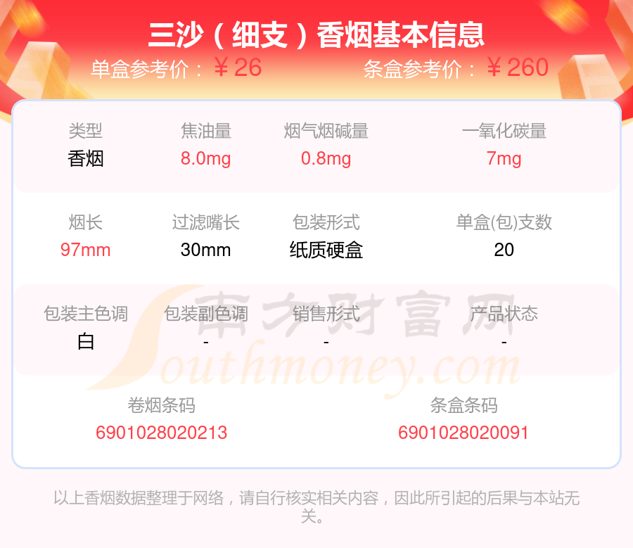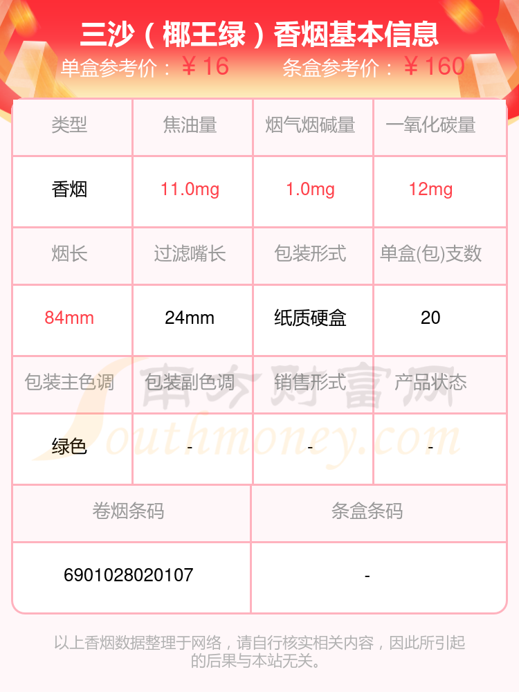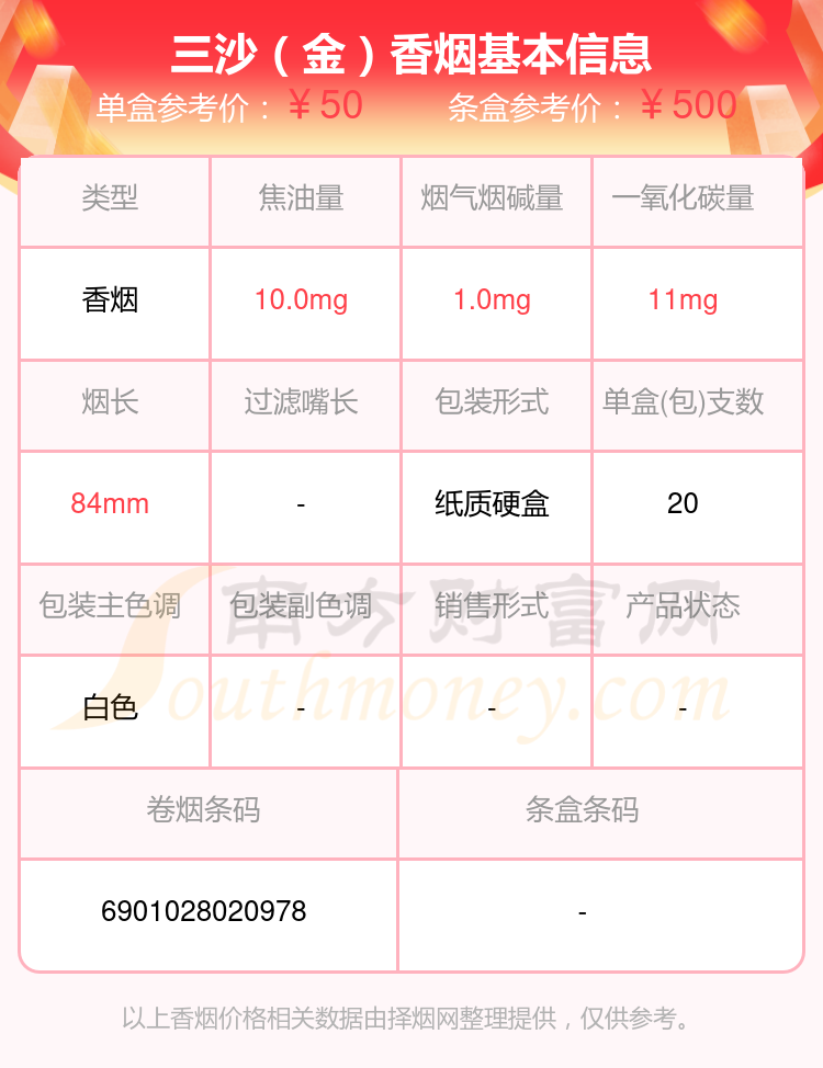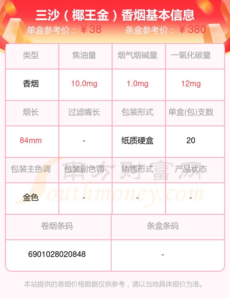 三沙(椰王金)参考价38.0元/包、三沙(金)参考价50.0元/包、三沙(椰王绿)参考价16.0元/包、三沙(细支)参考价26.0元/包、三沙(中支)参考价26.0元/包等。