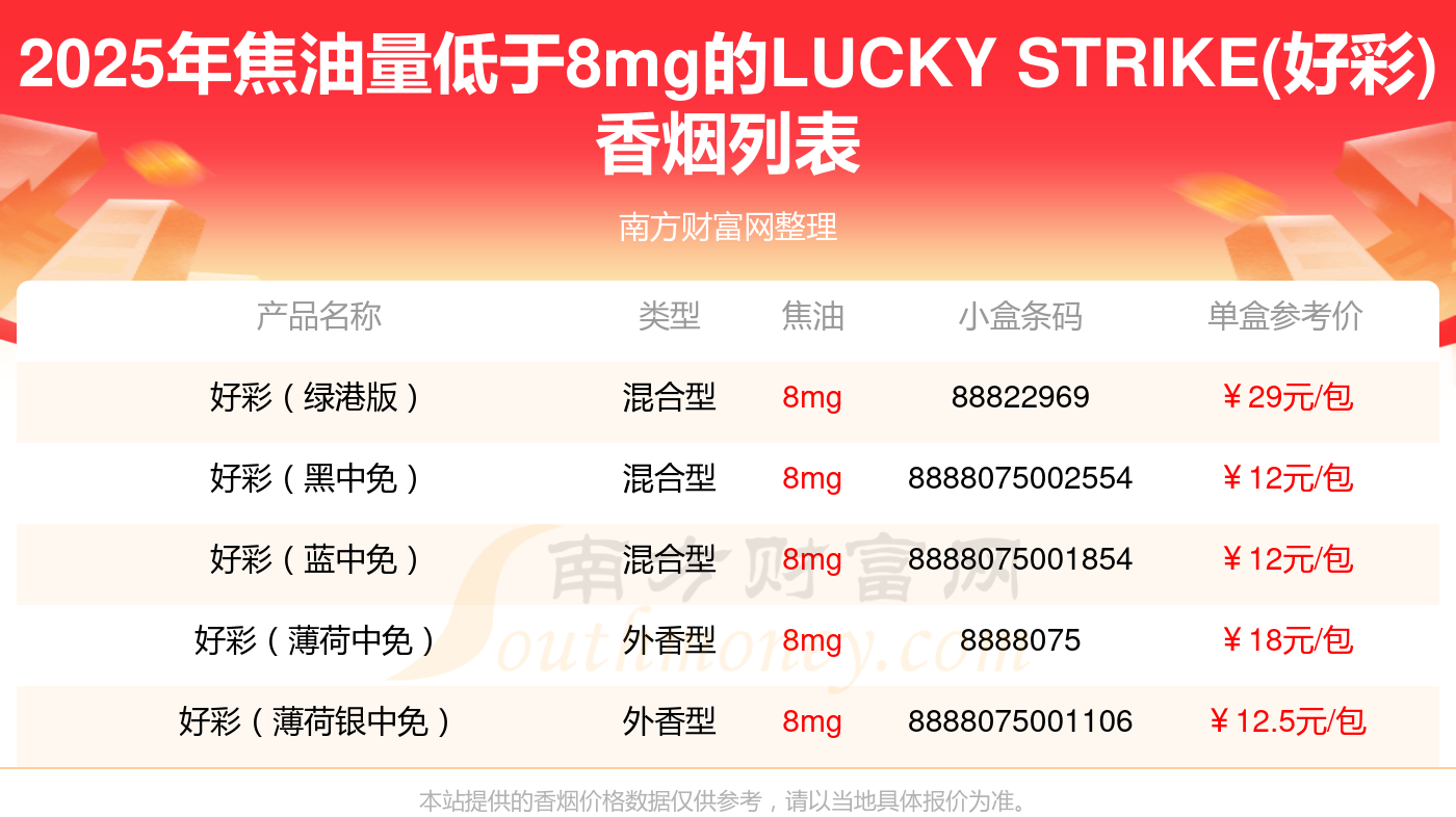 择烟网为大家盘点了焦油量低于8mg的LUCKY STRIKE(好彩)香烟,分别有好彩(绿港版)、好彩(黑中免)、好彩(蓝中免)、好彩(薄荷中免)、好彩(薄荷银中免)等,具体价格如下: