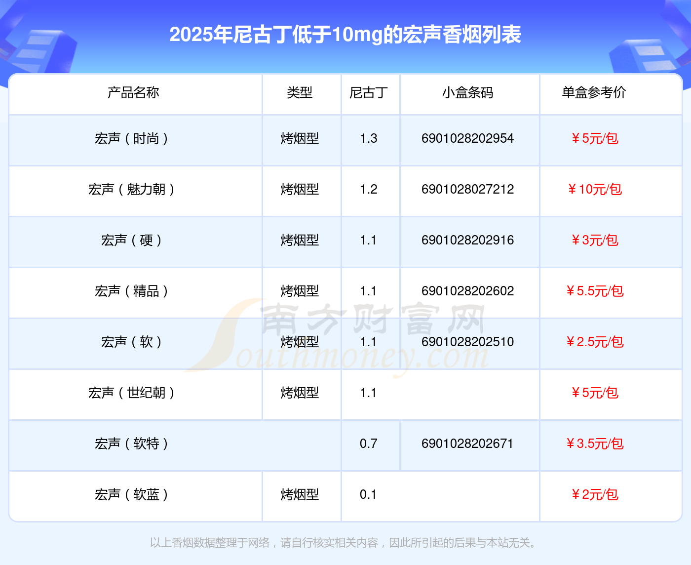 择烟网为大家盘点了宏声香烟尼古丁低于10mg的,分别有宏声(时尚)、宏声(魅力朝)、宏声(硬)、宏声(精品)、宏声(软)、宏声(世纪朝)、宏声(软特)、宏声(软蓝)等,具体价格如下: