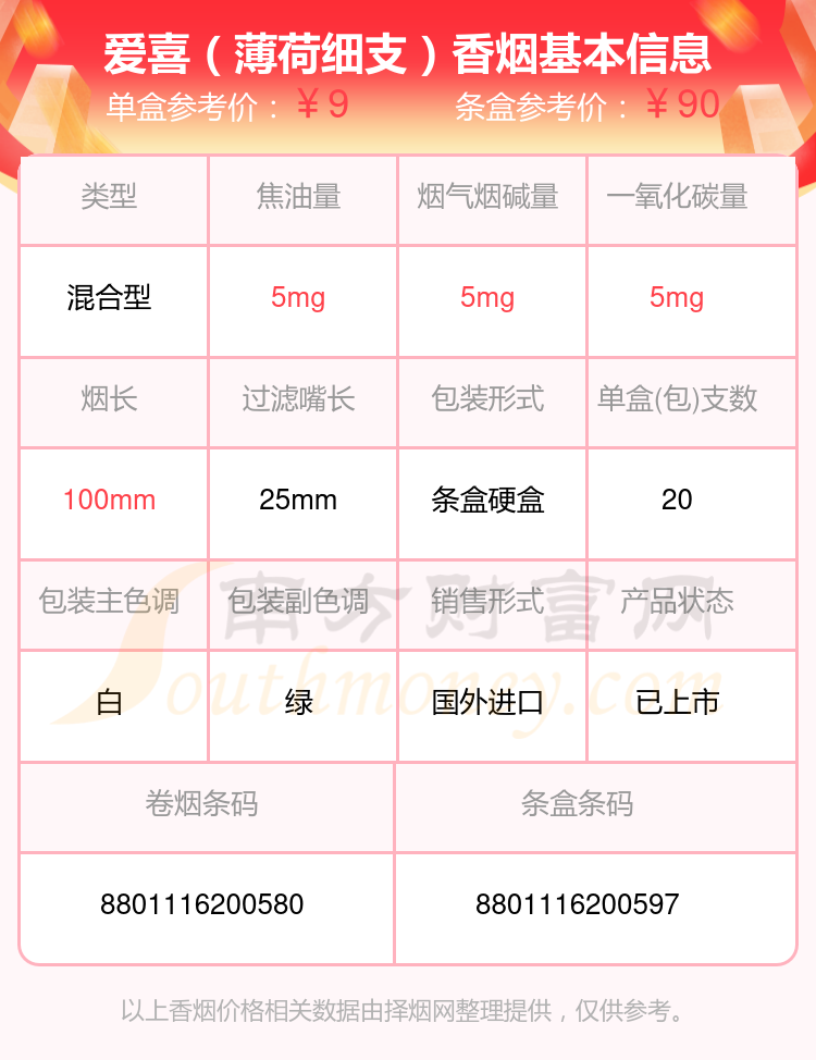 烟碱超过4mg的ESSE(爱喜)香烟有哪些?择烟网为大家整理盘点,分别有:爱喜(薄荷细支)、爱喜(金)等,具体价格如下: