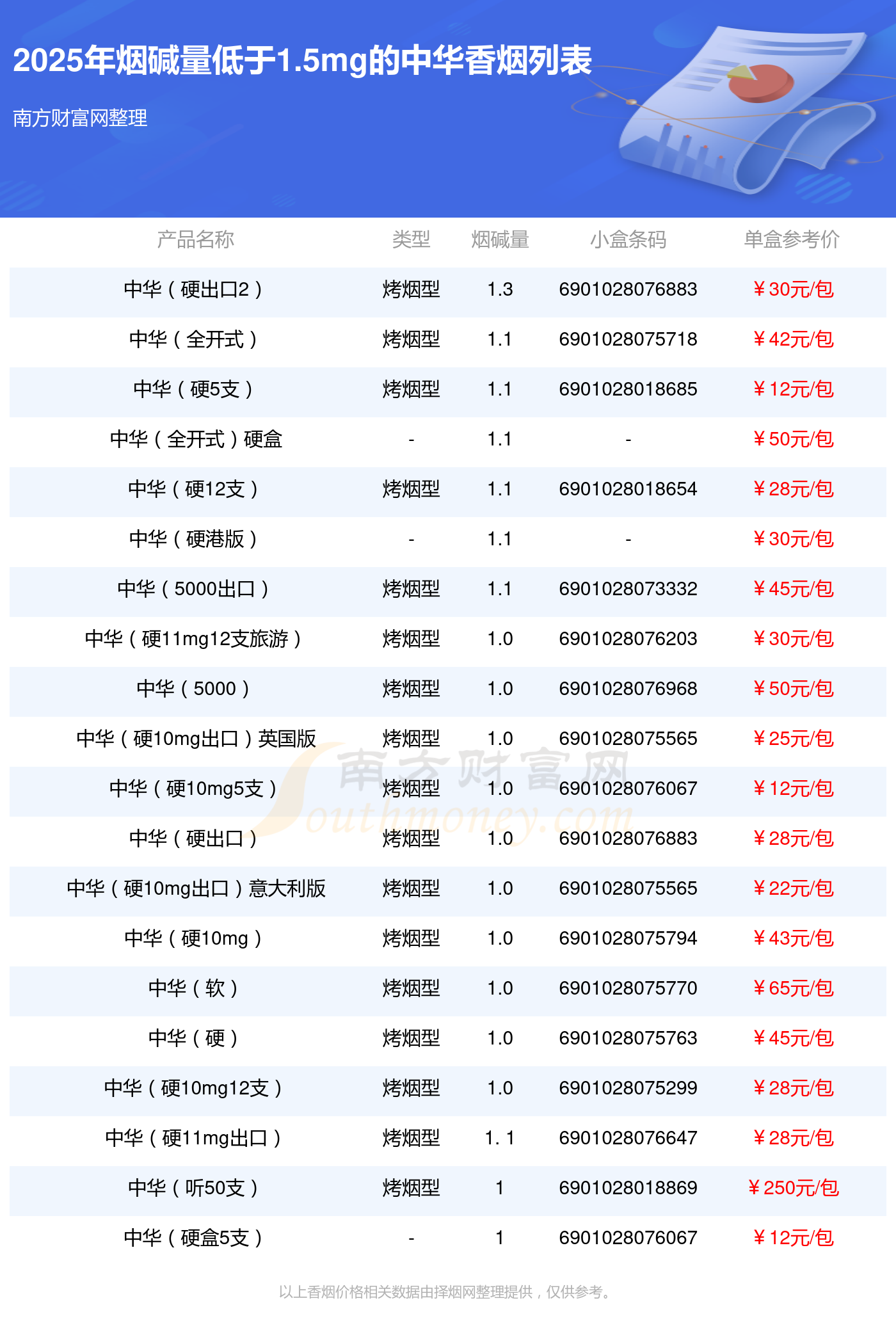 择烟网为大家盘点了烟碱量低于1.5mg的中华香烟,有中华(硬出口2)、中华(全开式)、中华(硬5支)、中华(全开式)硬盒、中华(硬12支)、中华(硬港版)、中华(5000出口)、中华(硬11mg12支旅游)、中华(5000)、中华(硬10mg出口)英国版等,详细价格如下: