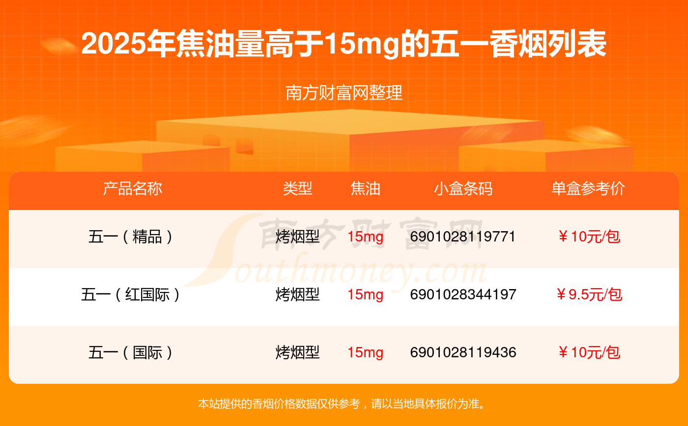 五一香烟焦油量高于15mg的烟有哪些?择烟网为大家整理提供,分别有:五一(精品)、五一(红国际)、五一(国际)等,具体价格如下: