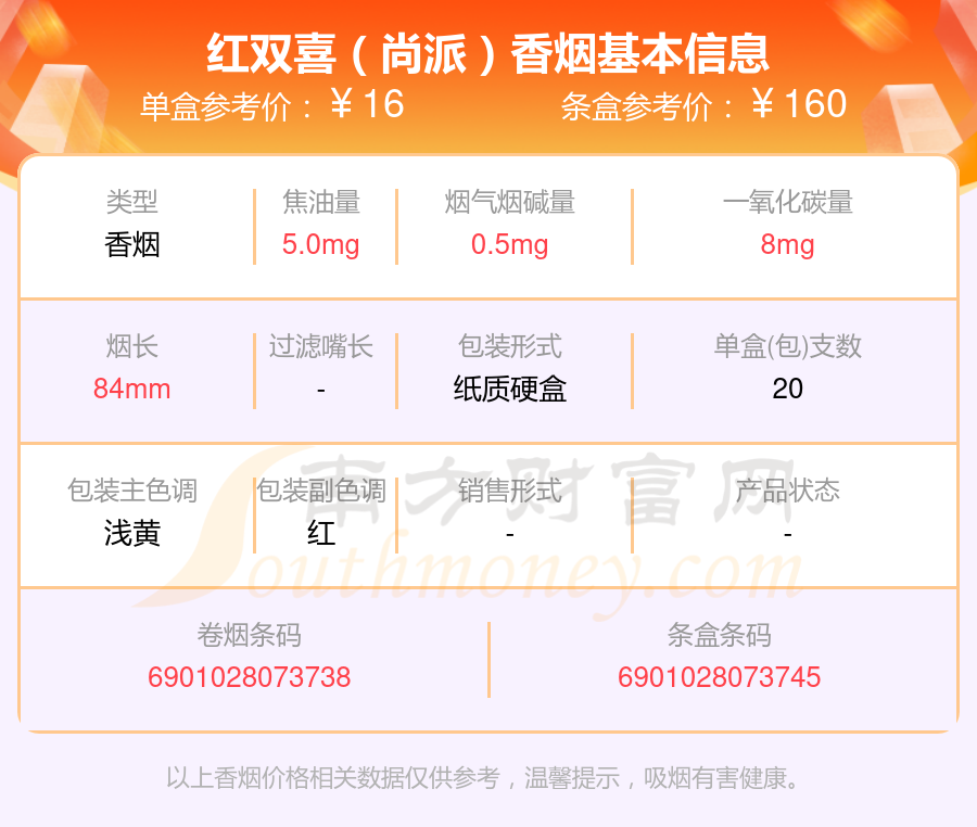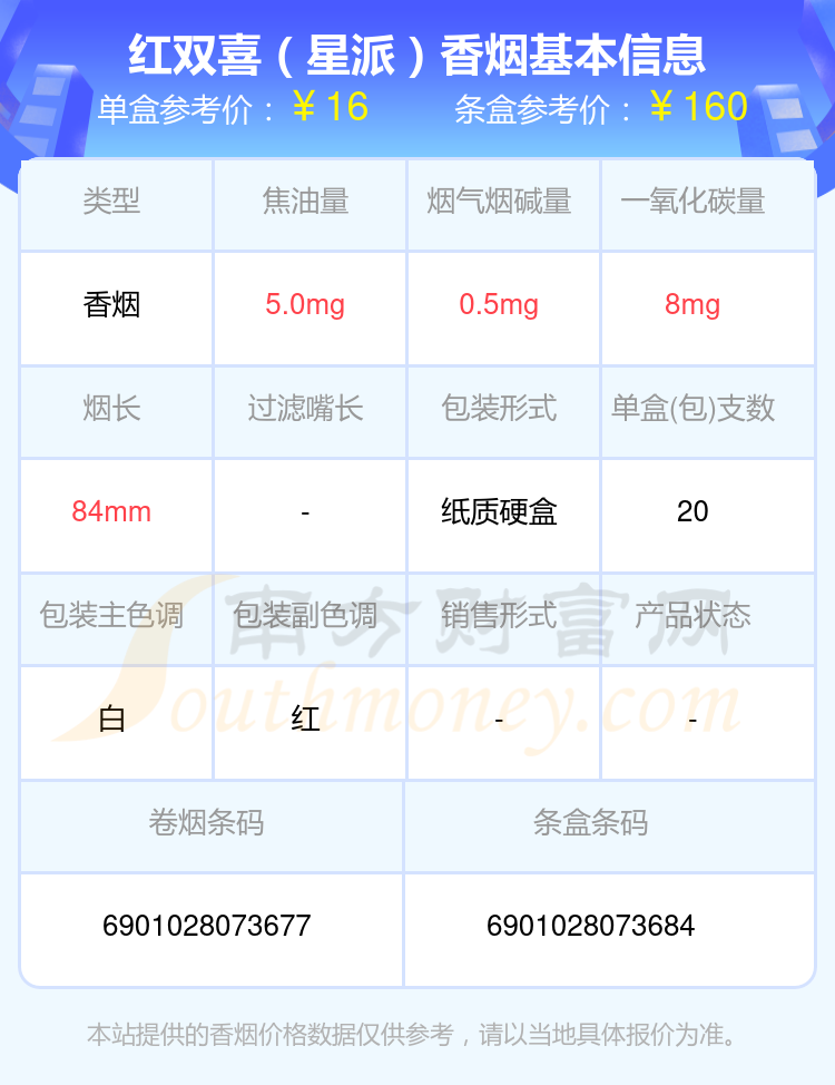 红双喜(星派)参考价16.0元/包、红双喜(尚派)参考价16.0元/包、红双喜(荷派)参考价16.0元/包、红双喜(铂派)参考价27.0元/包等。