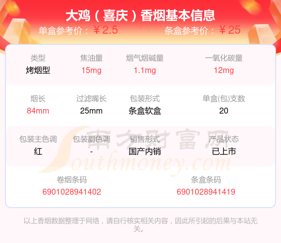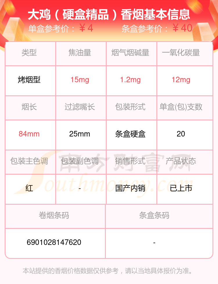 大鸡(硬盒精品)参考价4元/包、大鸡(喜庆)参考价2.5元/包、大鸡(全包)参考价2.5元/包、大鸡(富贵)参考价3元/包、大鸡(出口)参考价2.5元/包等。