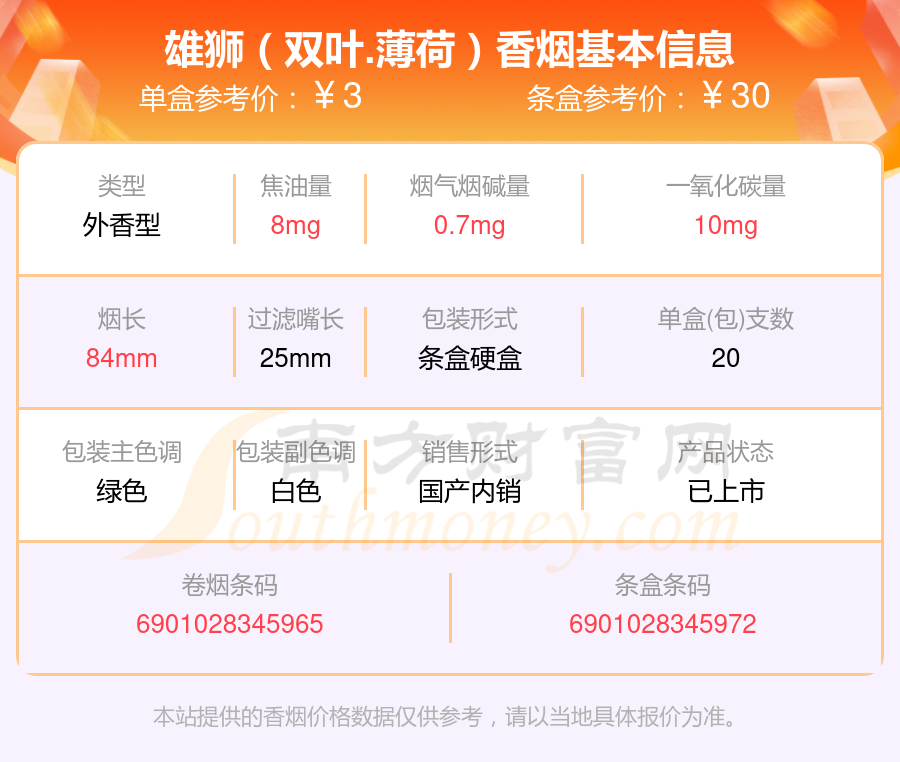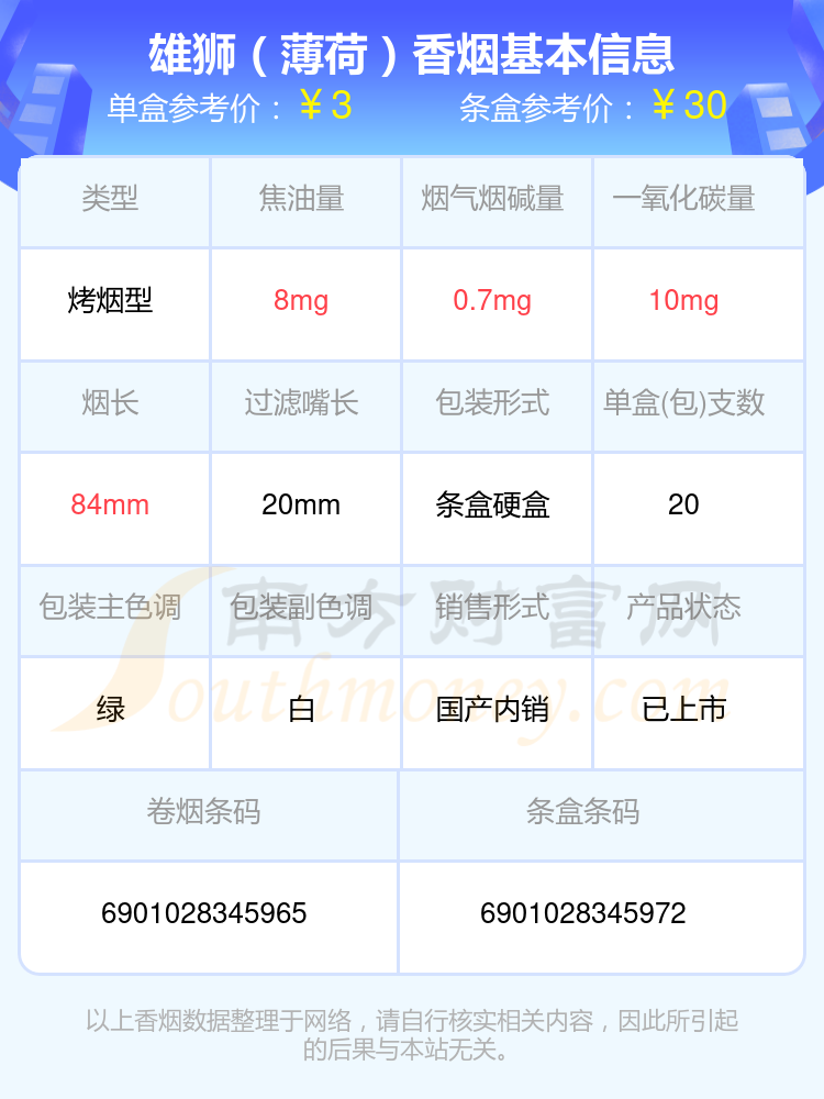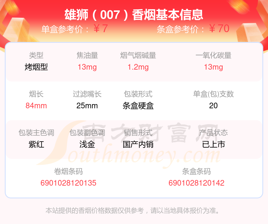 择烟网为大家盘点了雄狮香烟尼古丁2mg以下的,分别有雄狮(吉祥)、雄狮(新)、雄狮(007)、雄狮(红老版)、雄狮(红)、雄狮(双叶.薄荷)、雄狮(硬)、雄狮(薄荷)等,详细价格如下:
