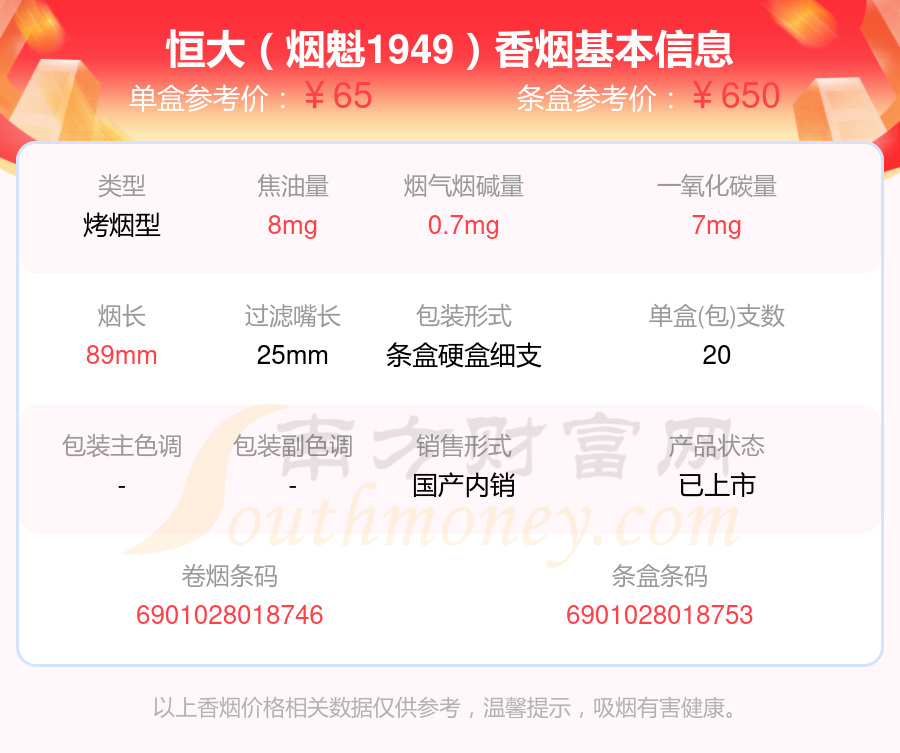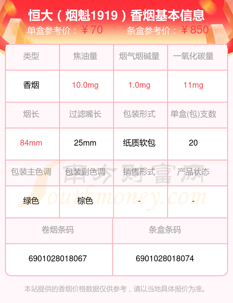 恒大(烟魁1919)参考价70.0元/包、恒大(烟魁1949)参考价65元/包、恒大(烟魁1949中支)参考价65元/包等。