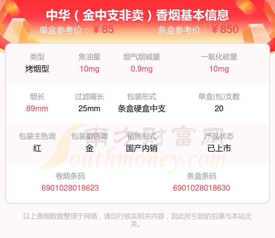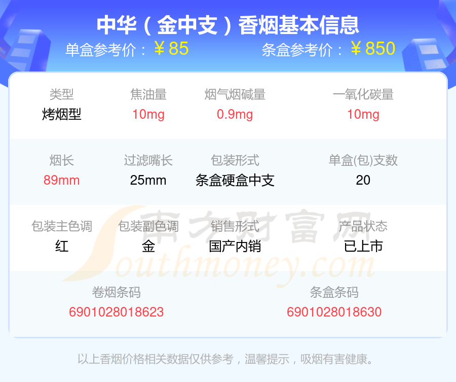 中华(金中支)参考价85元/包、中华(金短支)参考价85元/包、中华(金中支非卖)参考价85元/包、中华(听50支)参考价250元/包、中华(大中华)参考价100.0元/包、中华(金细支)参考价100.0元/包等。