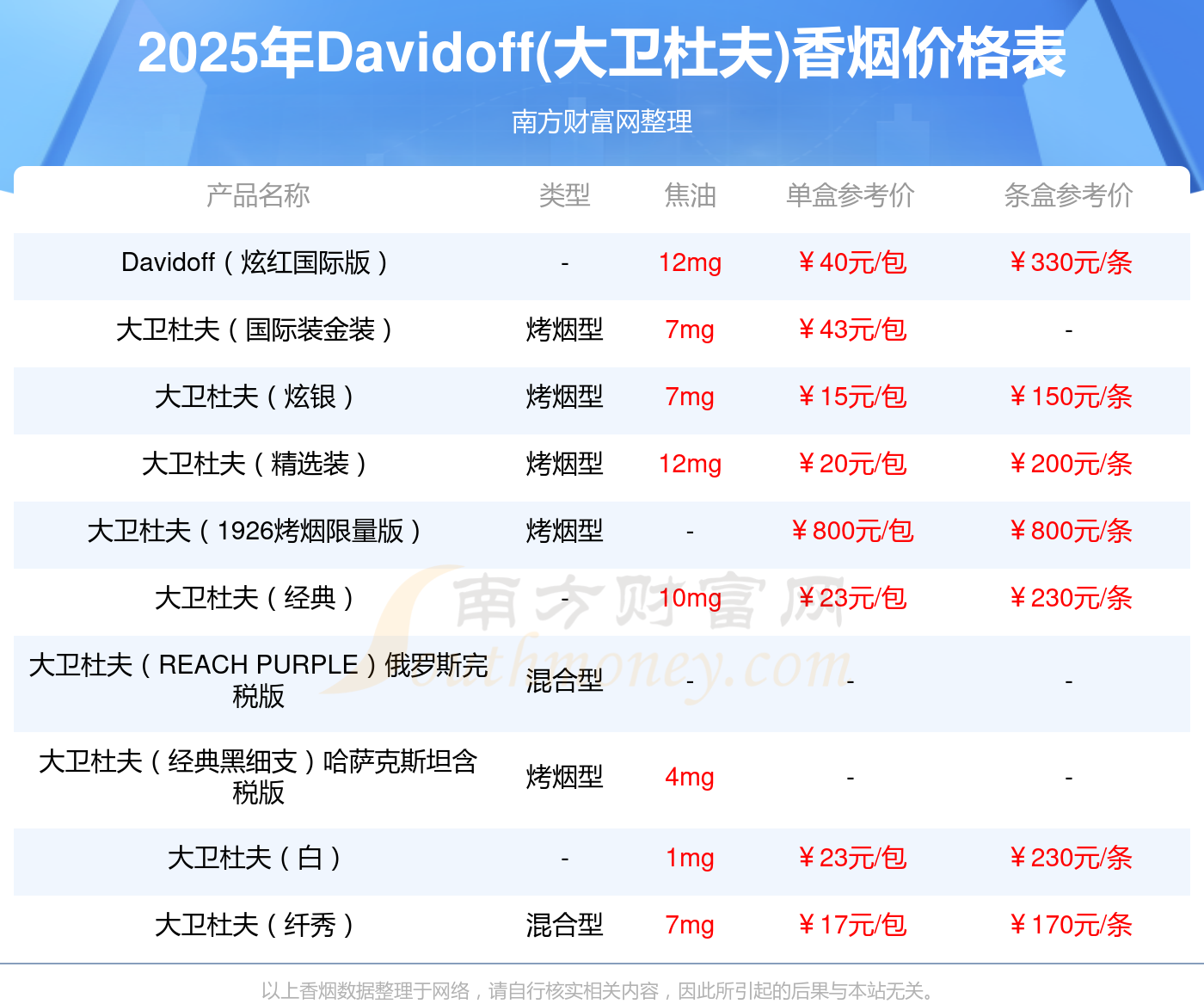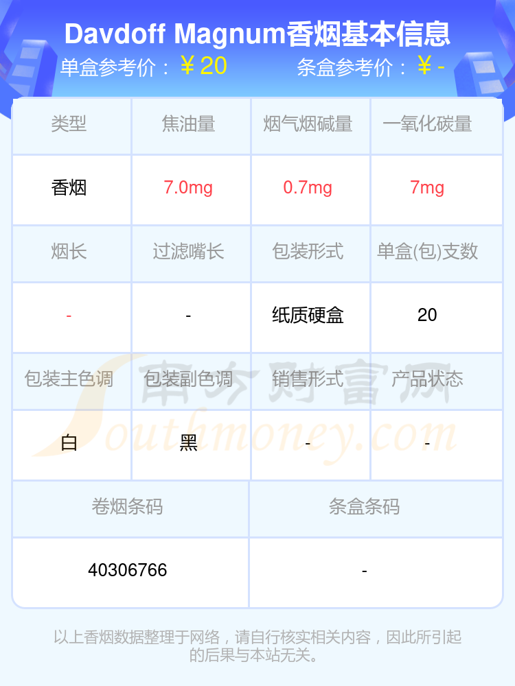 以上香烟数据整理于网络,请自行核实相关内容,因此所引起的后果与本站无关。